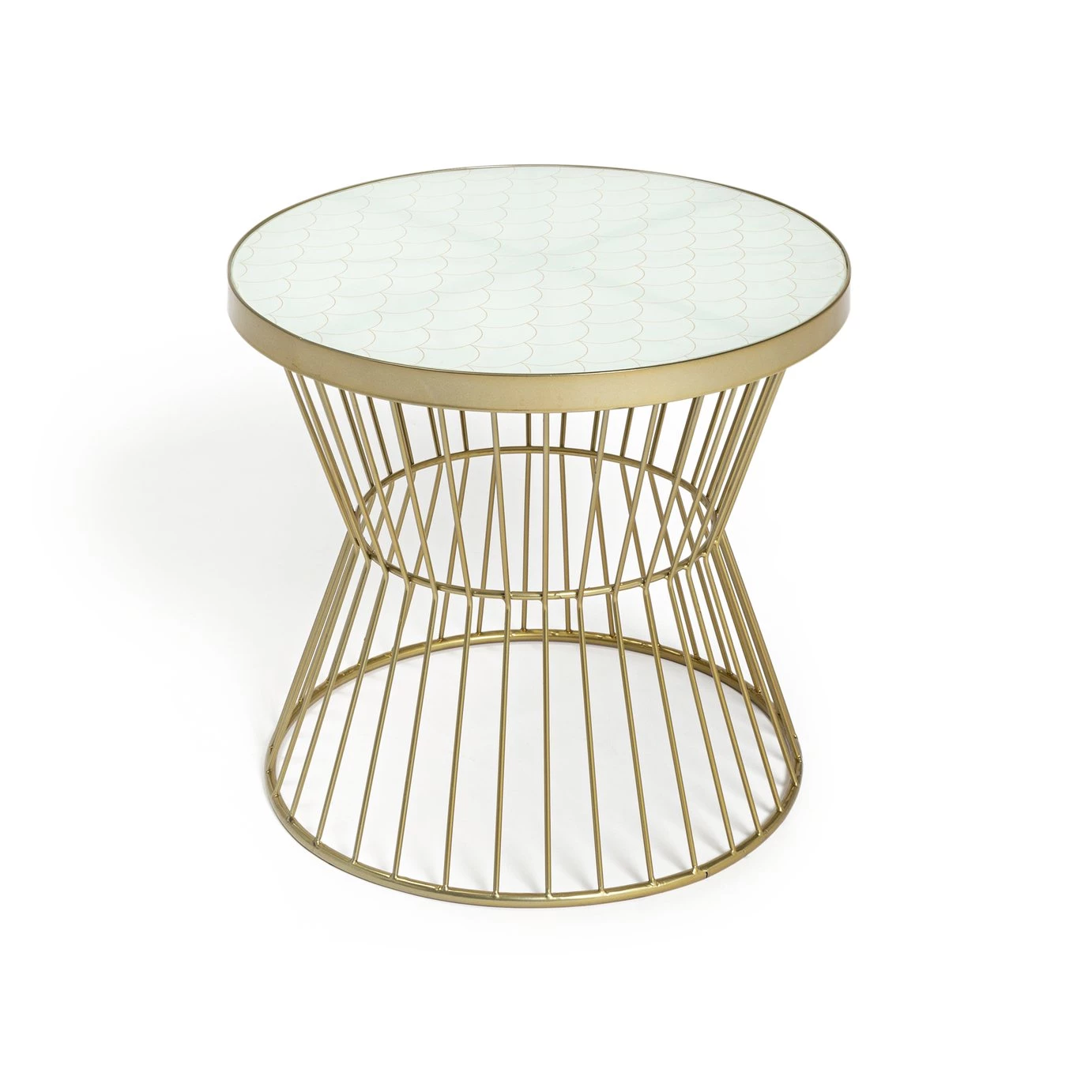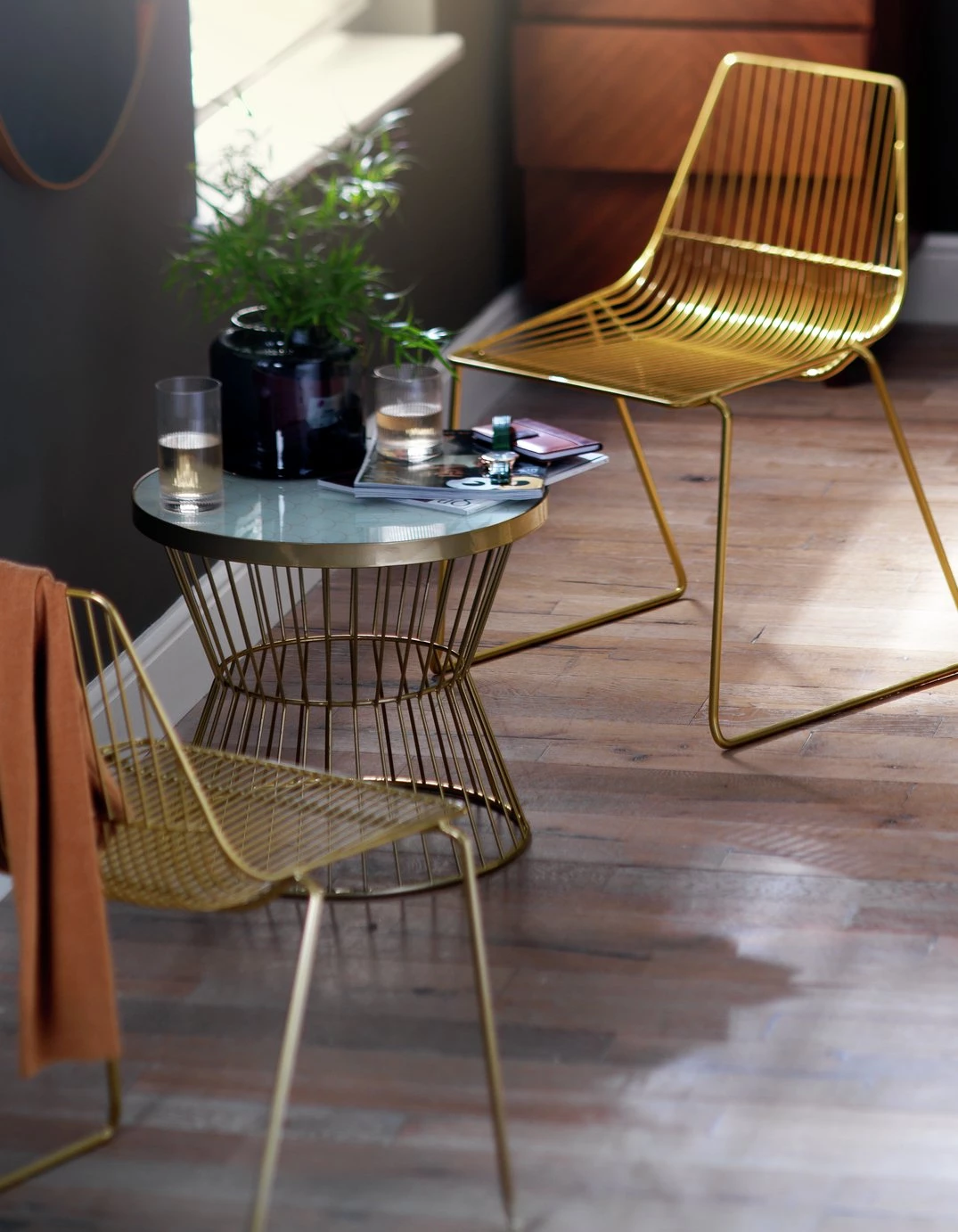 From Paris with love. Bring the chic feel of a Parisian bistro into your home with Huxley. Comprising a table and 2 metal chairs, the polished brass finish of this set is not just elegant, but durable and rust resistant too. The transfer printed glass tabletop hits the Luxe interiors trend perfectly and the wire framed chairs exude style.