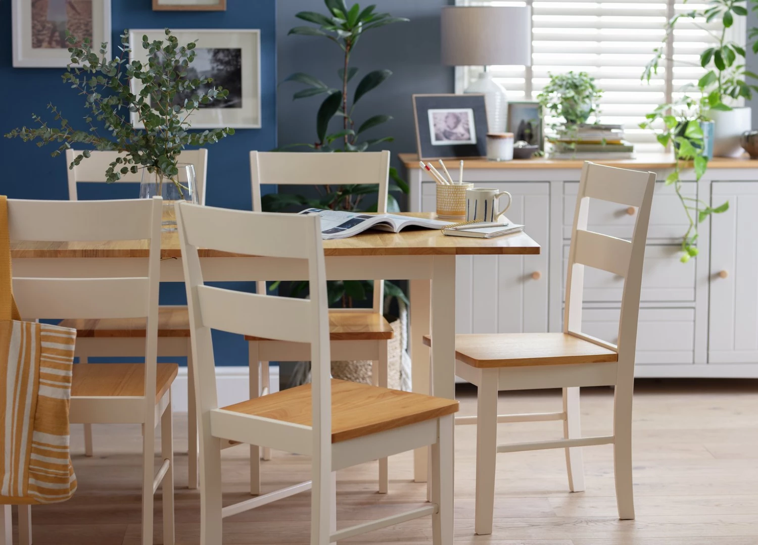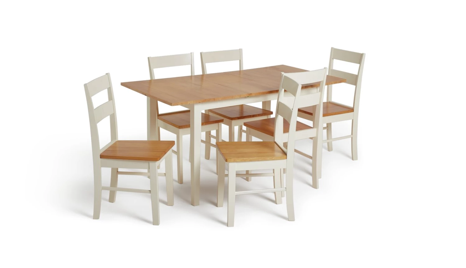 If your taste is traditional, you'll love the Habitat Chicago's classic look. In a bright, airy off-white and wood design, it's two-tone finish offers a touch of country cottage charm. Perfectly sized for smaller dining areas, the extending section is hidden discreetly underneath the middle of the table. Simply pull each end apart to reveal, lift and unfold into place. This hardwearing solid wood set comes with 6 stylish chairs that complement the table perfectly.