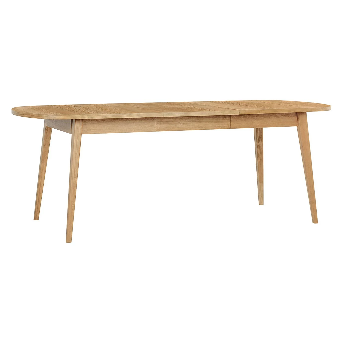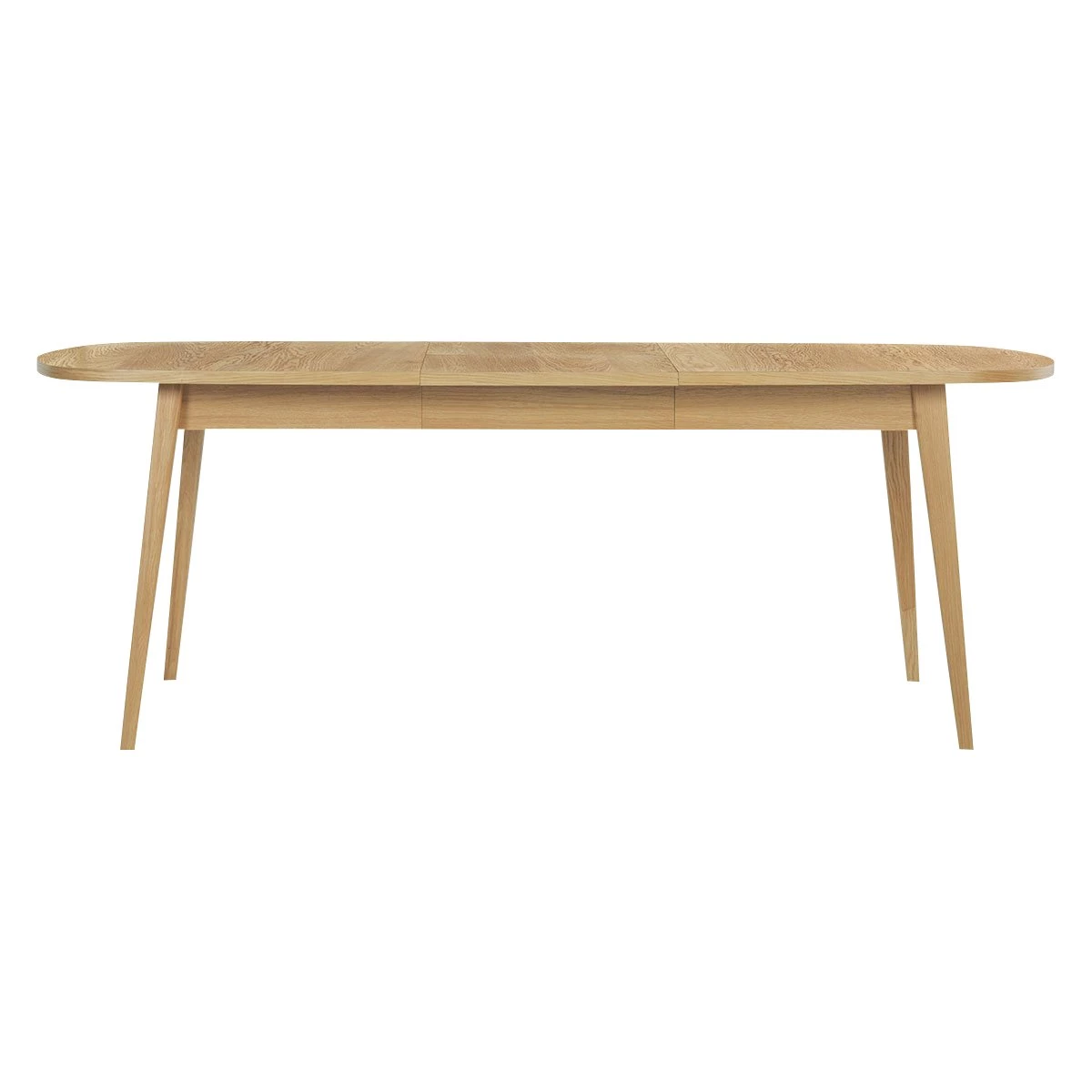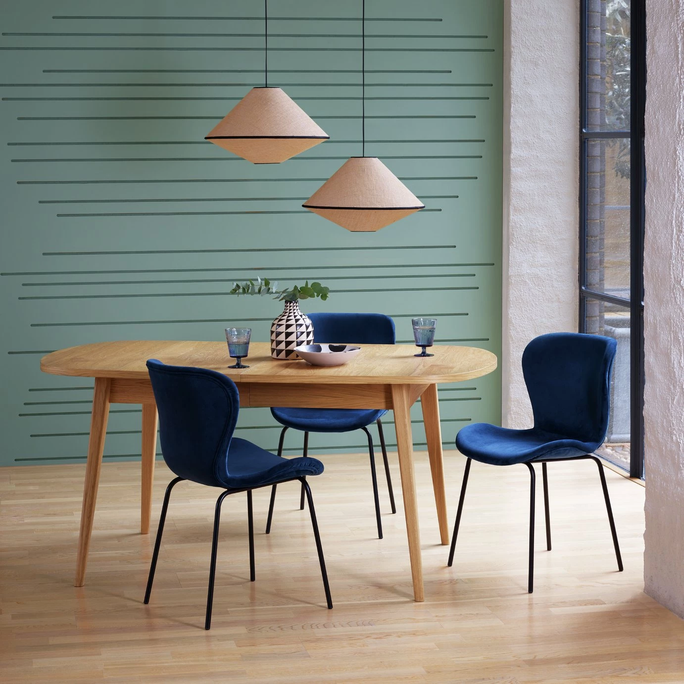 The Etta 6-8 seater oak extending dining table has a gently rounded, veneered top and elegant, tapered legs in solid oak. A compact, slightly feminine design, the Etta table is perfect for smaller living spaces and has a simple extension mechanism. Exclusive to Habitat and also available in black-stained oak. The Etta table is made in Estonia and has a matt lacquer finish to protect its surface.