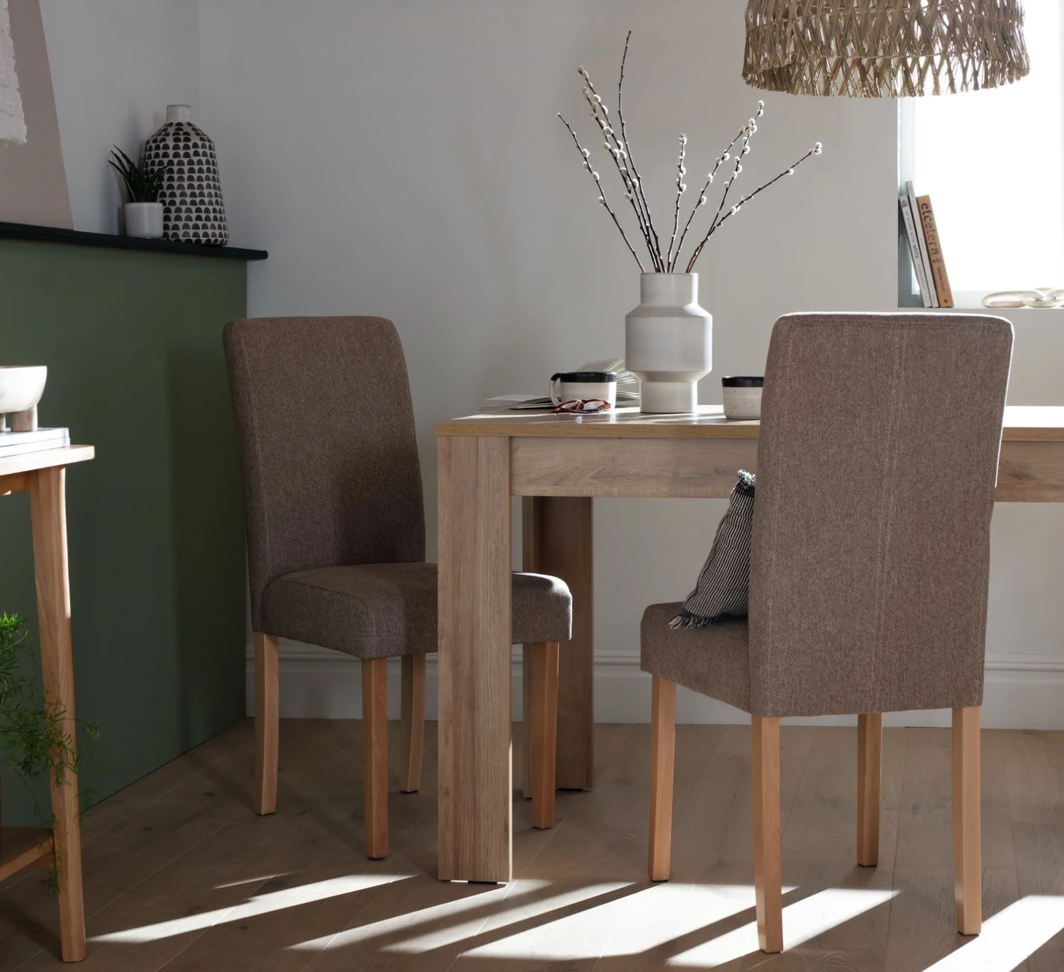 A dashing duo. Settle down for dinner with our charming pair of mid back fabric dining chairs. In rich brown, they're a classic choice that fits well in both colourful and laid back decor schemes. And in polyester they're long lasting and comfy. Complete with pale wooden legs for a natural finishing flair. Pull up a chair and tuck in.