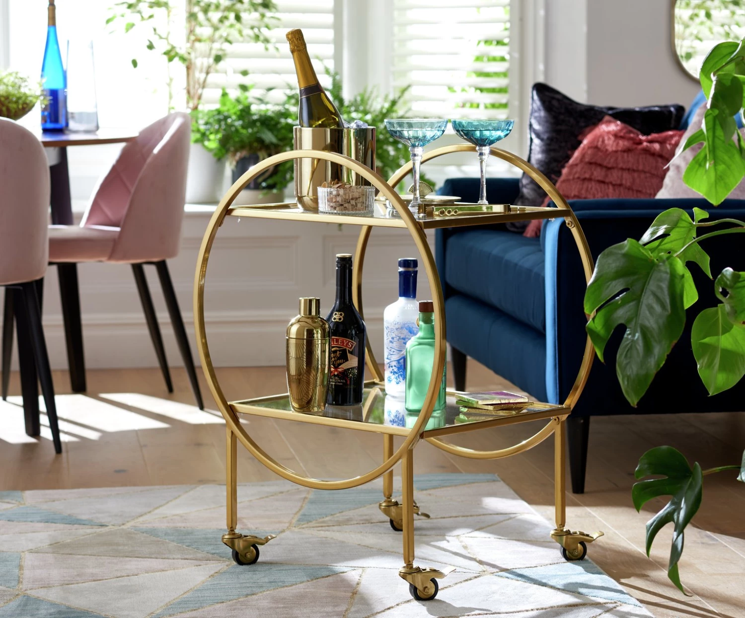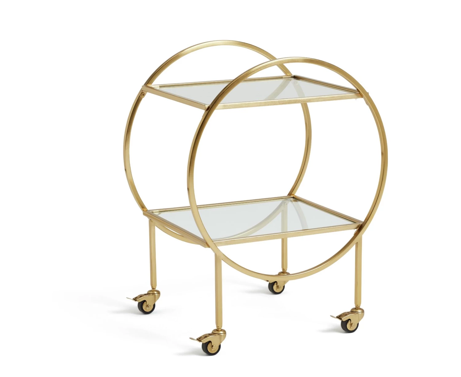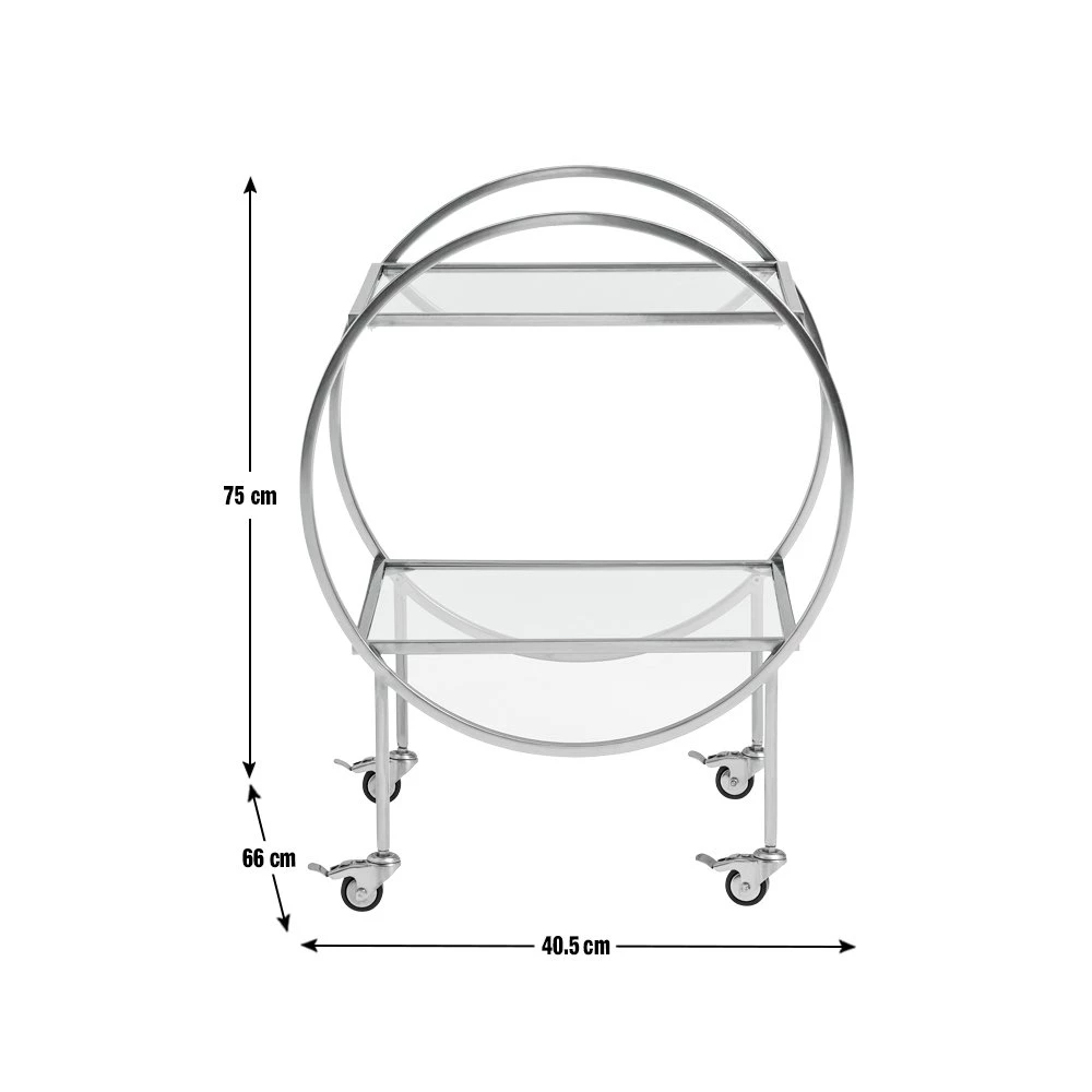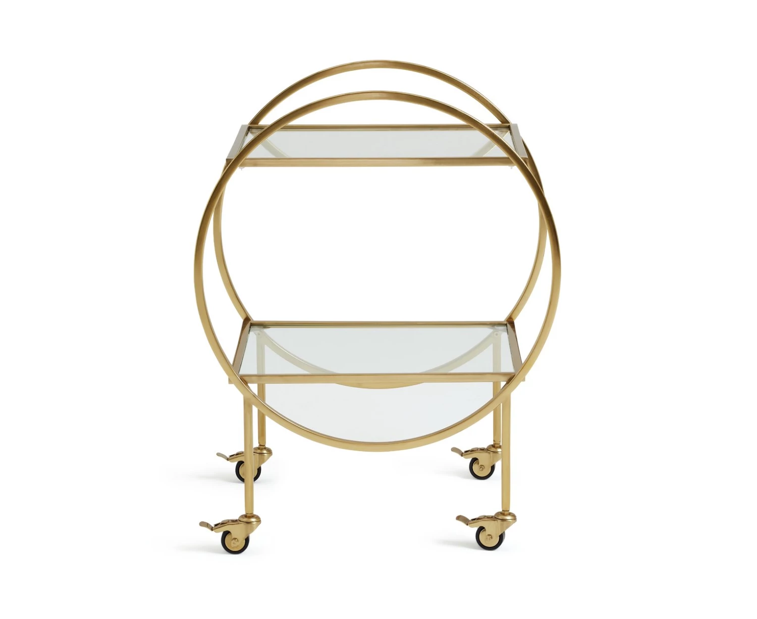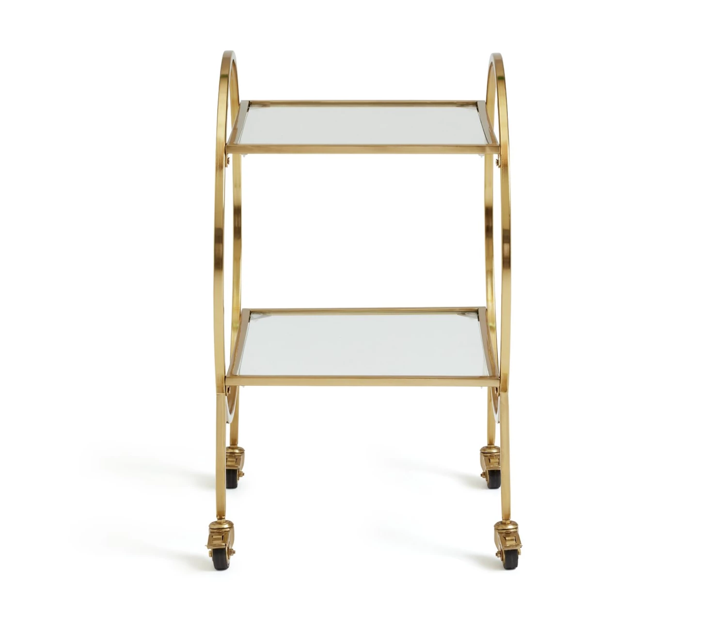 Modern bar trolley with rich gold finish and clear glass. Easy to move and 2 wheels does have lock to make the table stable hence making its use hassle free so that you can enjoy your drinks and occasions. Two levels of storage will hold ample amount of bottles and other bar accessories.
