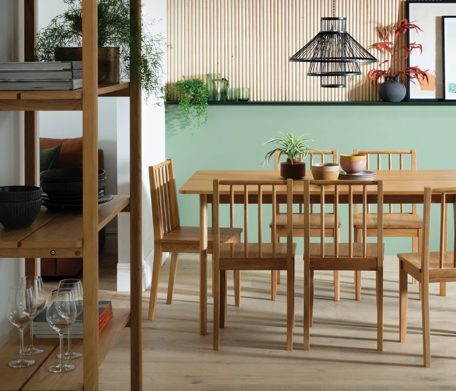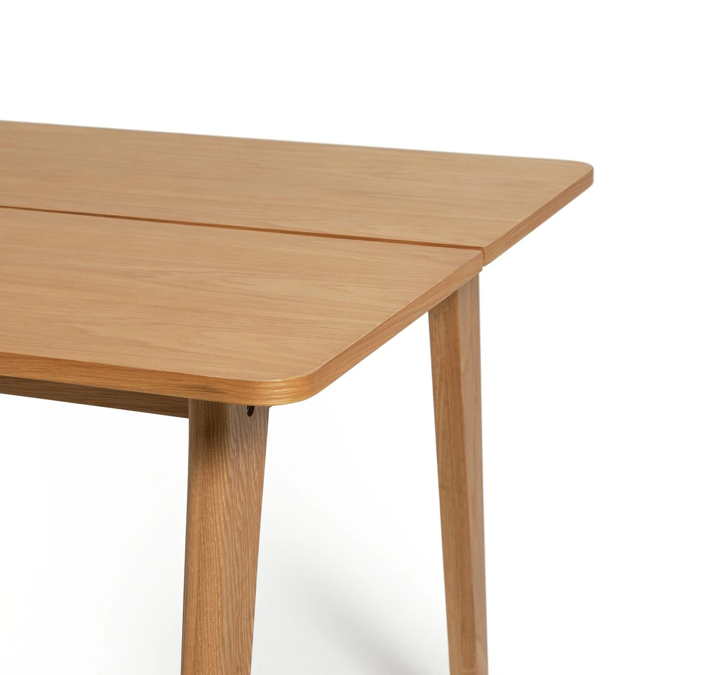 Classic country dining. Settle down for breakfast, lunch and dinner at our 4 seater dining table. The clean and simple design with gently tapered legs brings a natural feel to your kitchen or dining room. It's modern but with a comfortably traditional feel. Crafted with a veneer oak finish that's easy to wipe clean. Gather family and friends for meal after meal, this is a piece that will be around for many years.