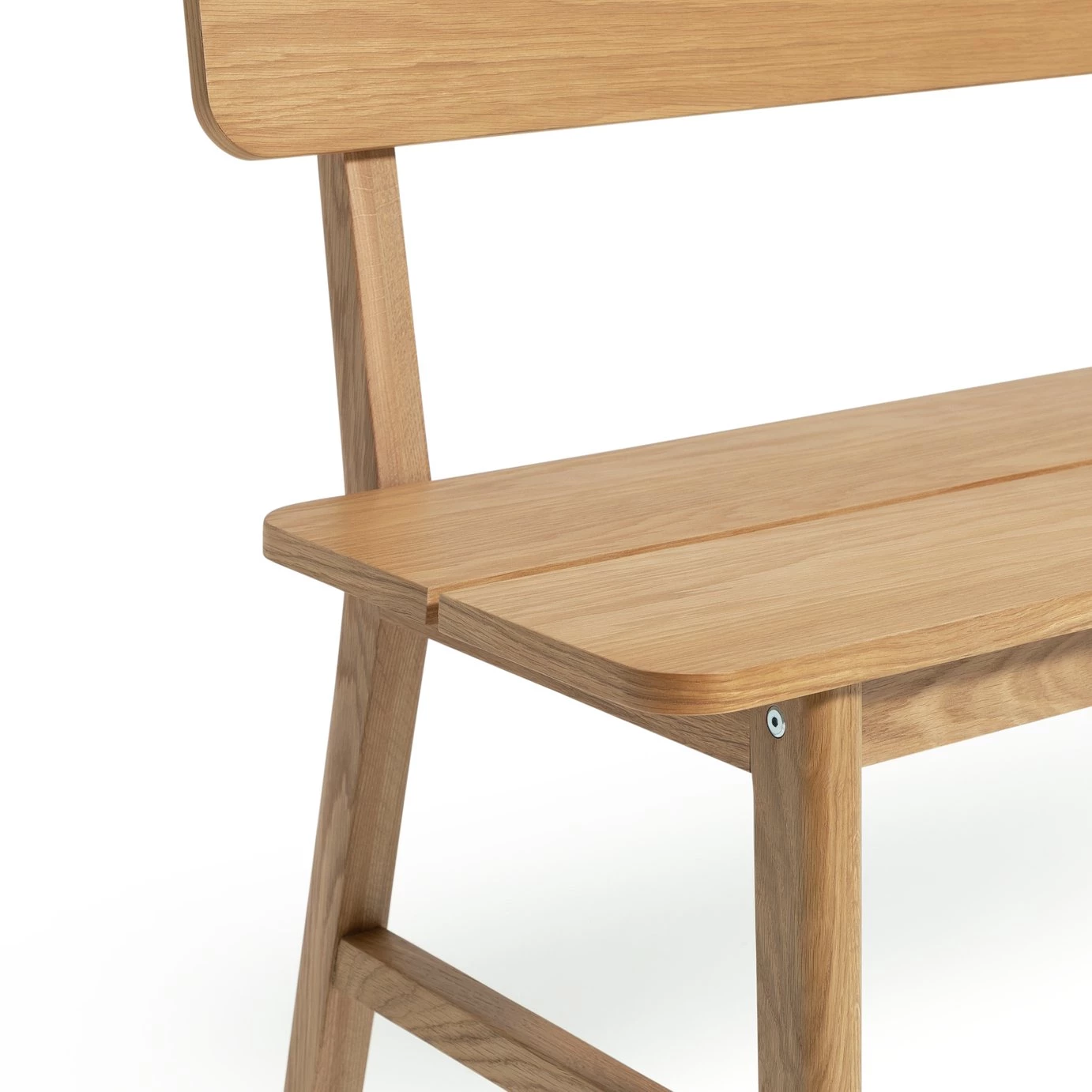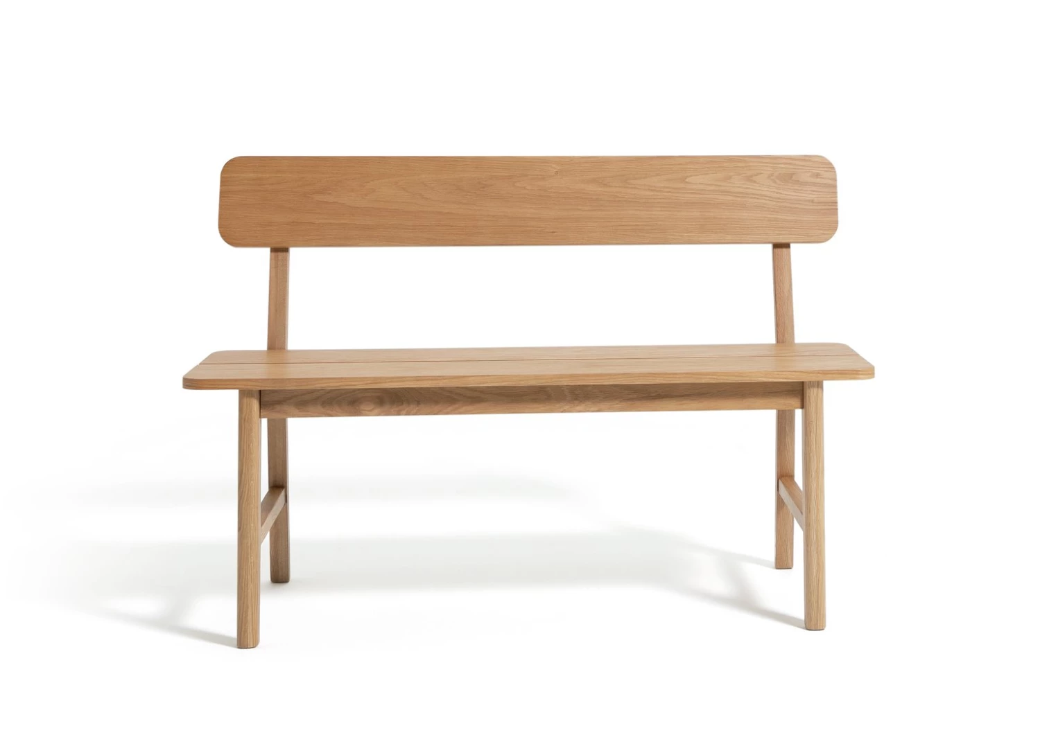 Settle in for good times. Our lightly coloured oak dining bench brings a touch of modern country to your kitchen or dining room. Gently curved edges soften the clean simple design, and a comfy backrest makes it even more inviting. Pop a couple of seat cushions for extra comfy appeal. With plenty of space for 2 adults to or 3 children, it's family friendly. Slide along, supper's ready.