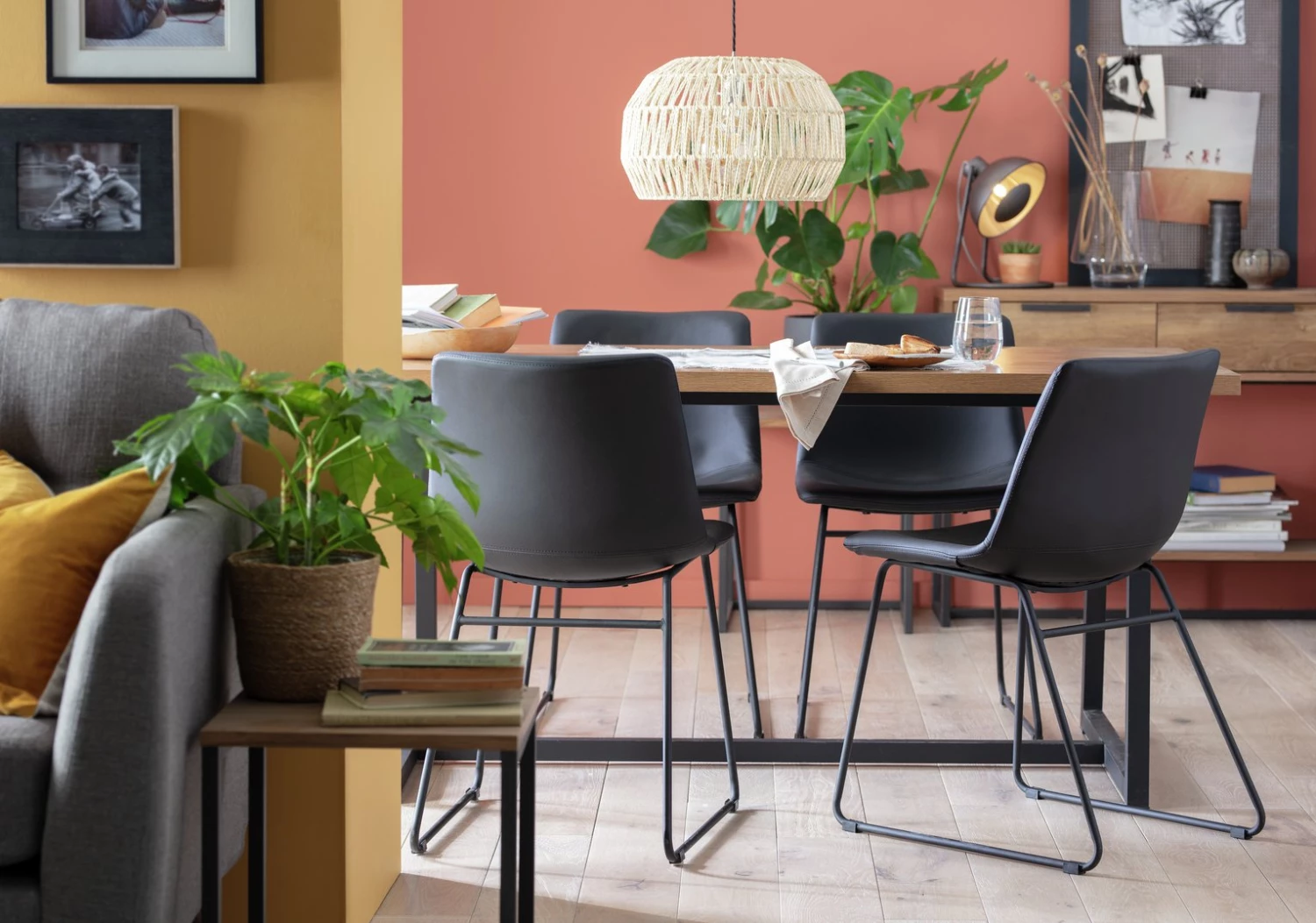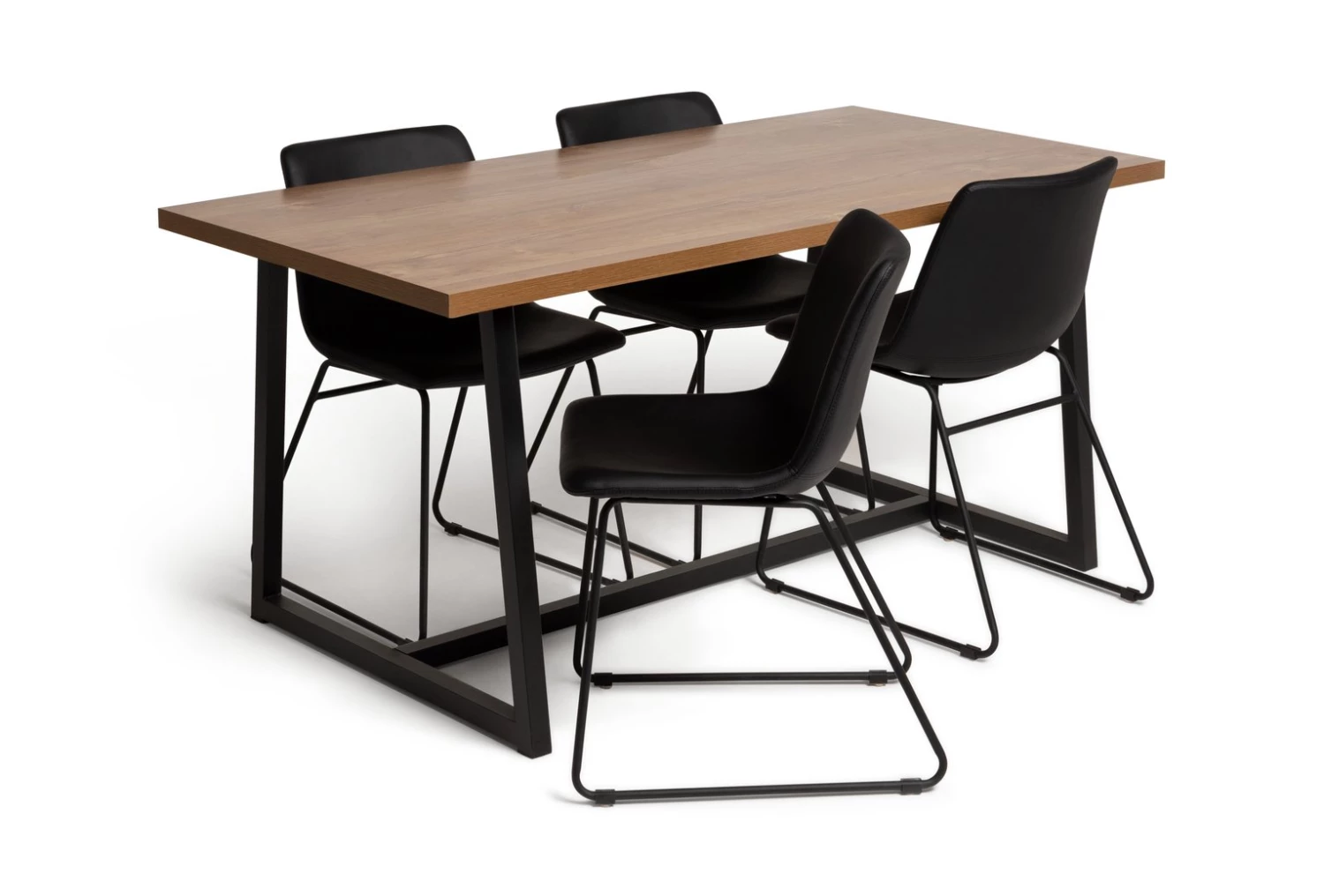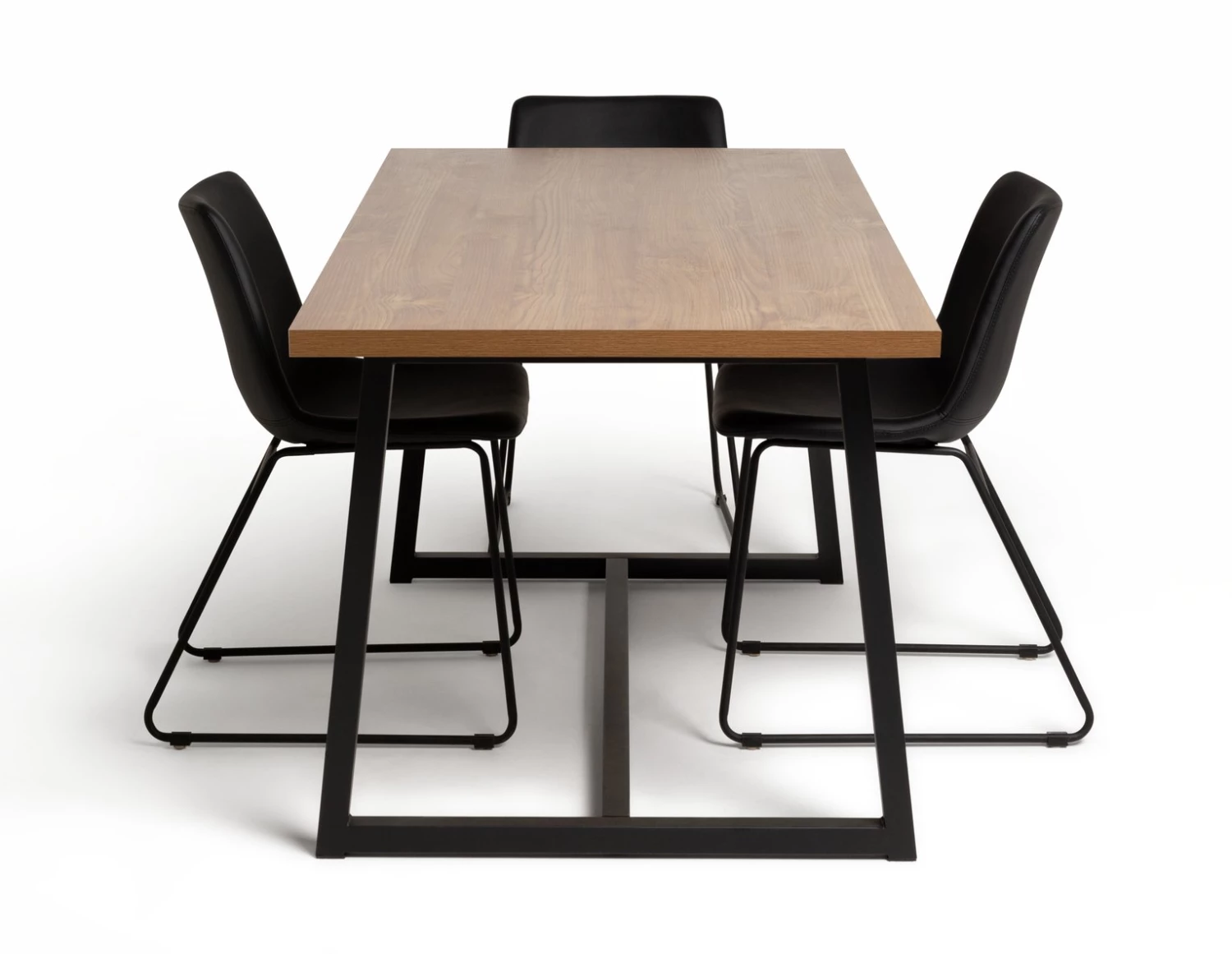 People round for dinner, nab yourself a winner. Our dining table and 4 matching chairs look expensive, but guess what? This oak wood effect table and luxury feel black chairs are a handsome sight. A clever blend of modern and traditional. Looks at home in a contemporary setting. Or just as inviting amongst classic decor. The table's solid metal legs are designed for your guests' comfort. As are the chairs. Soft seat pads have the look and feel of leather, without the upkeep. So, comfy, good looking and practical. We said it was a winner.
