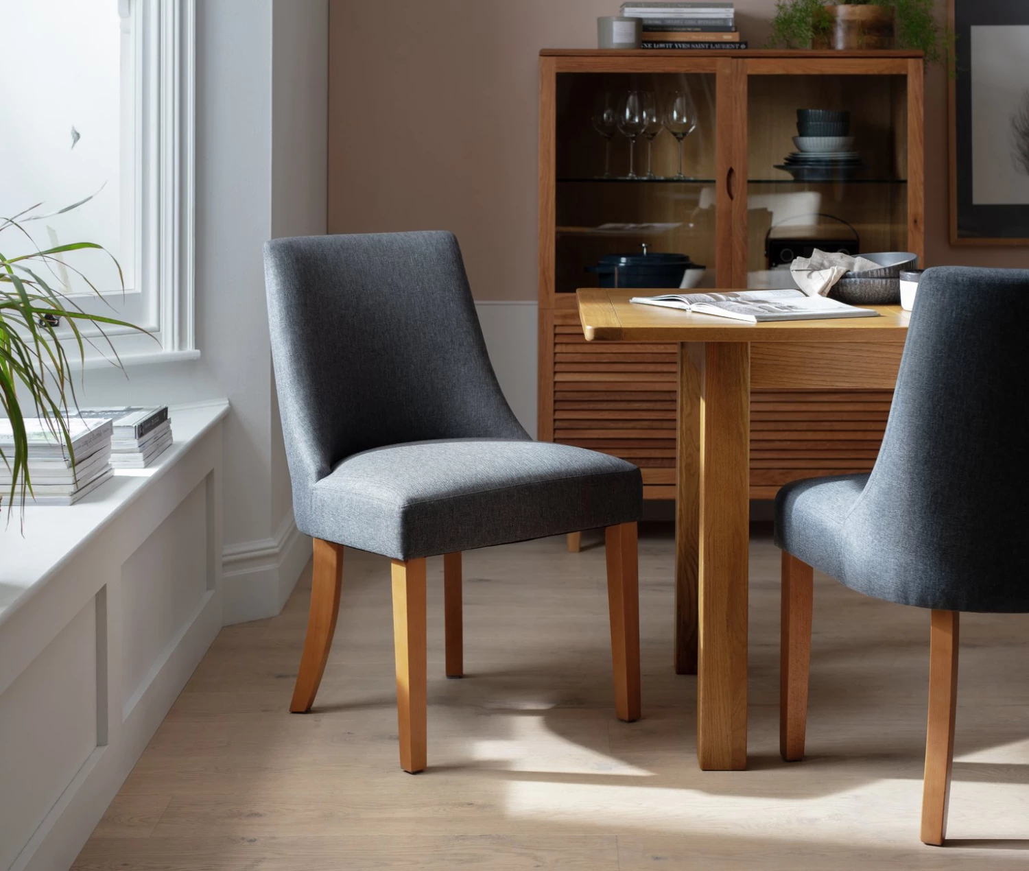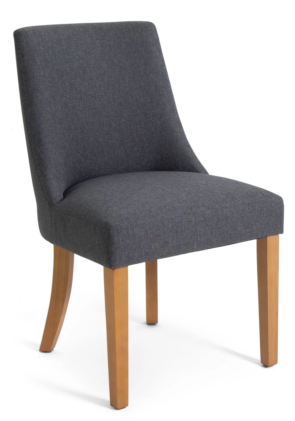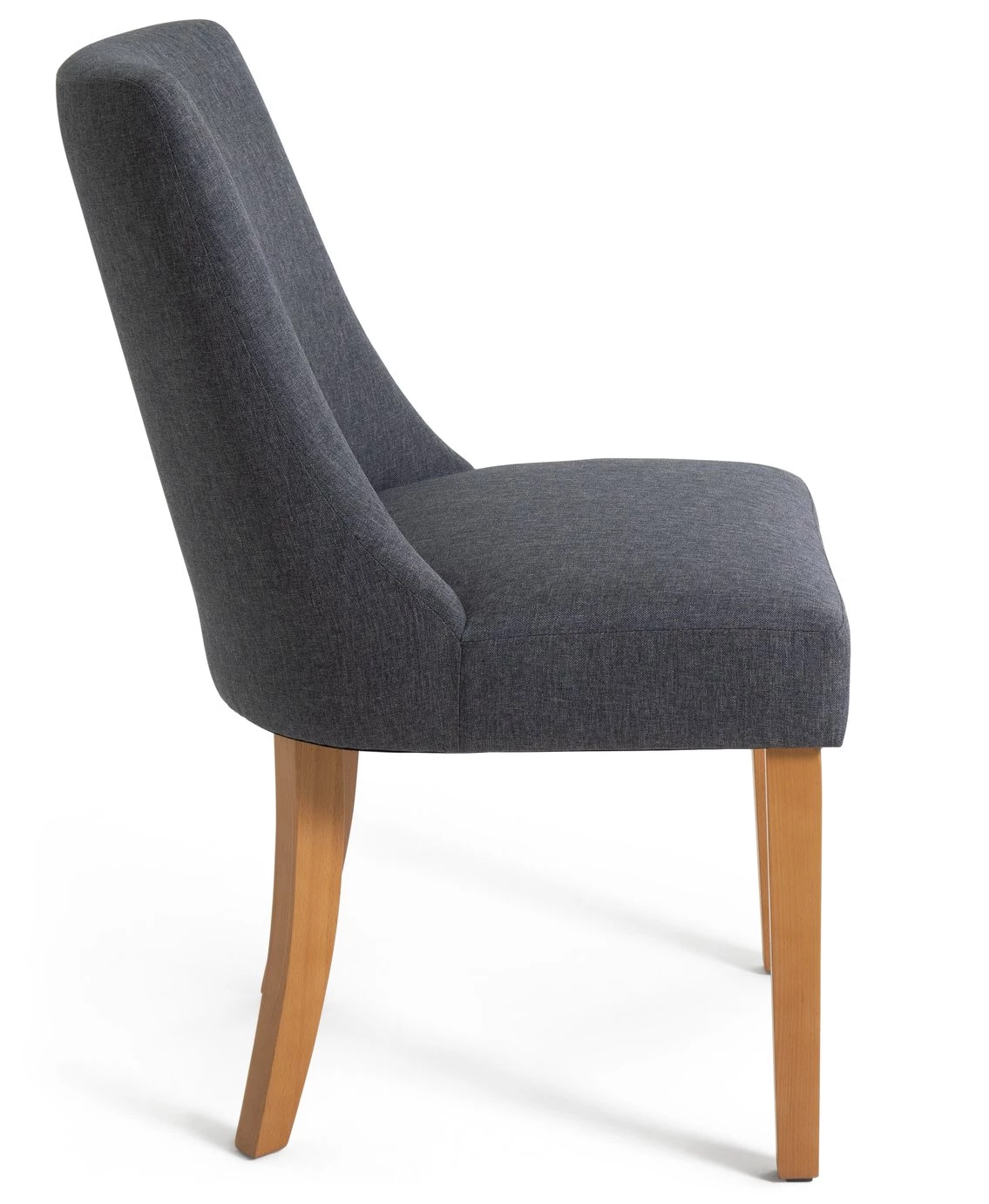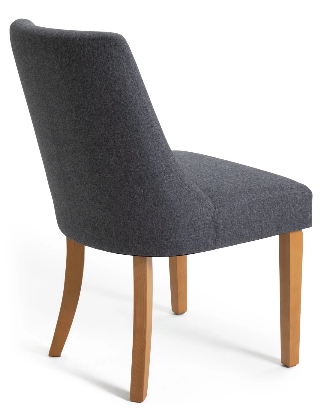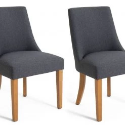Fine dining starts with fine seating. Our pair of modern midback dining chairs combine comfort with contemporary design. Charcoal upholstery contrasts beautifully against solid beechwood. With rear legs that add flair and bring a distinctively elegant touch. The padded seat and ergonomic shaped backrest support you all the way. So, pull up a chair, settle in, the night is young.
