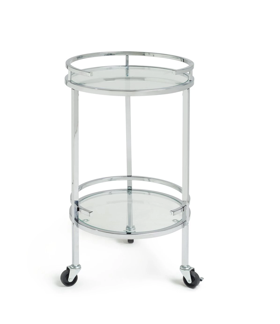 Cocktail time? Invite everyone back to yours with the stunning two-tiered Habitat drinks trolley. Made from chrome and glass, its clean-styled platform is perfect for serving drinks and nibbles or storing glasses and bottles. This smooth mover is set on three wheels to make it easy to manoeuvre from room to room or guest to guest. It makes a great home bar. Chin-chin.