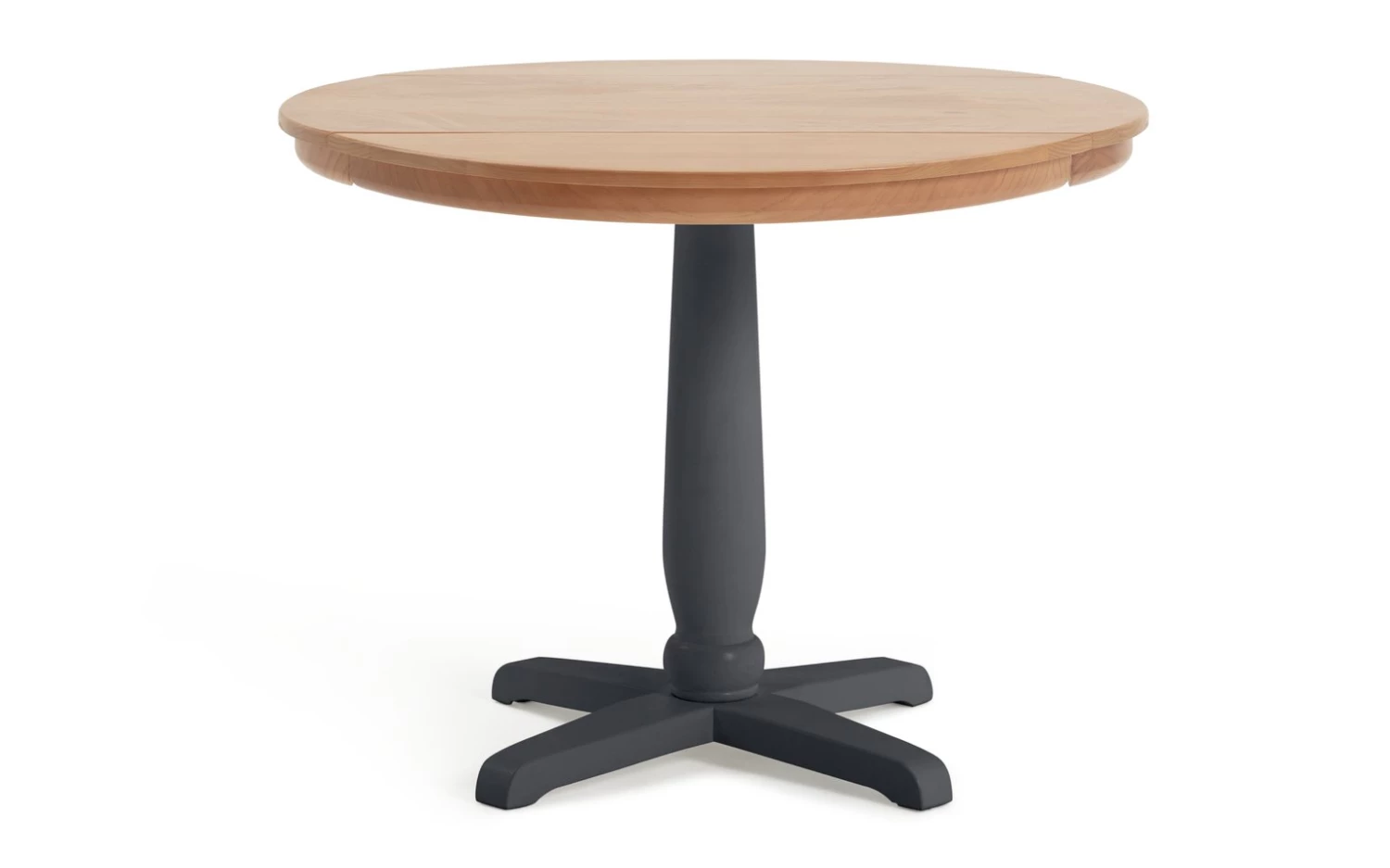 Drop dead gorgeous. Our Otis wood table is stylishly sturdy and a real space saver. The solid wood table top and painted legs are classic modern rustic. Seats four comfortably for dinner. Everyone finished? Drop the leaves, tuck against the wall and say hello to extra room. The palette of grey and natural wood adds to the feeling of spaciousness. Marvellous.