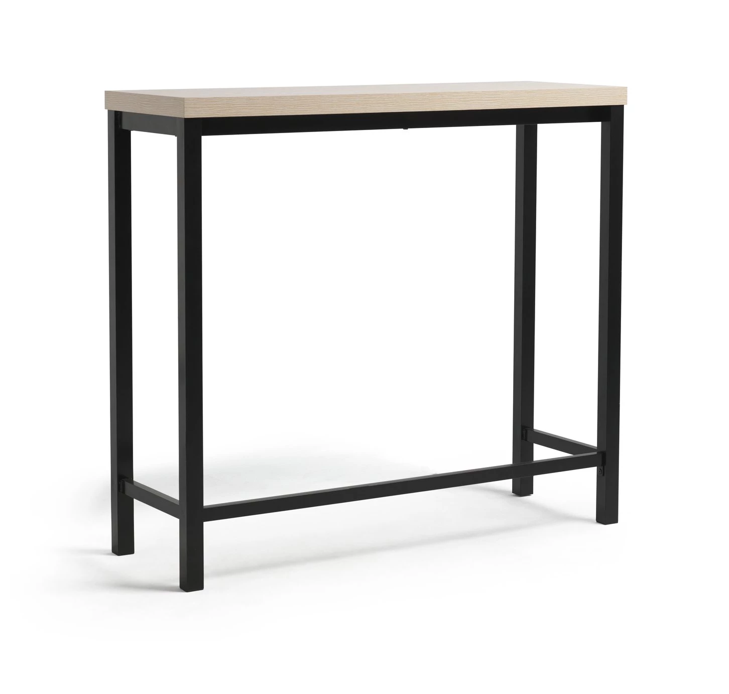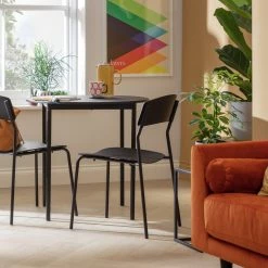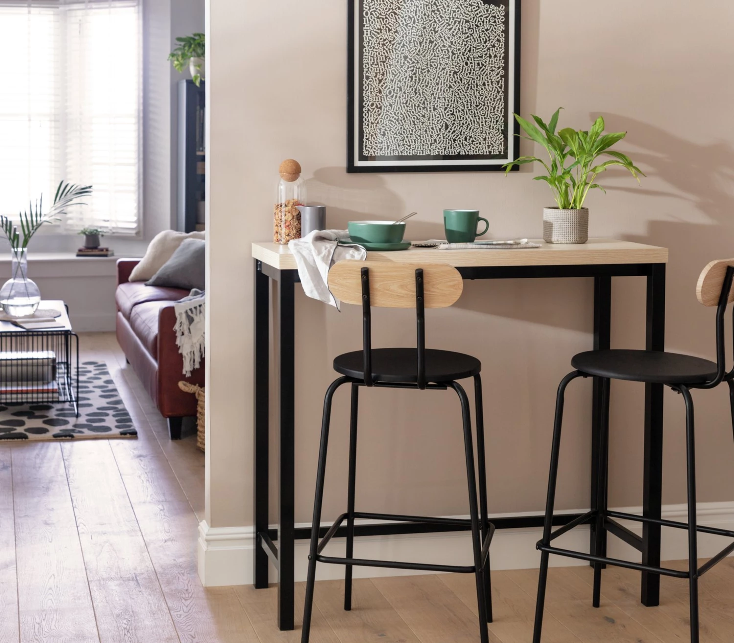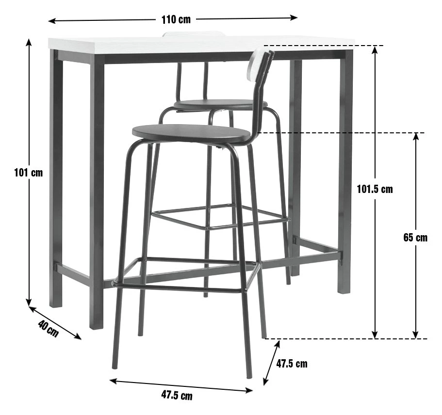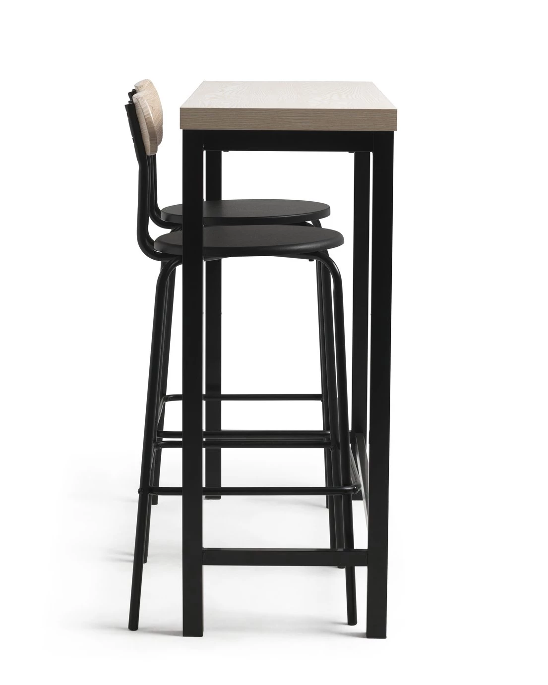 Set the bar with Zayn. This tall table and pair of bar chairs is slim, smart and space-saving. With a combination of black metal and natural looking ash effect, it's serving up an industrial feel. Croissants and a cuppa? The two of you can tuck into breakfast in style. And when it's time to party, turn this versatile table set into a cool cocktail bar. Mix it up.
