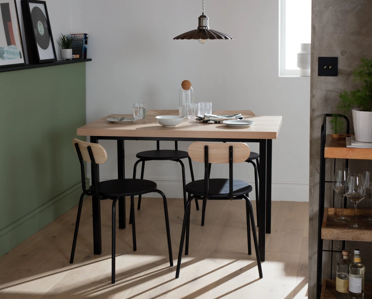 Modern mealtimes coming up. Slim, smart and space-saving, this 4-seater dining set is as industrial as it gets. Exclusive to Habitat, Zayn makes a subtle style statement with the rugged charm of black metal against pale ash woodgrain effect. 4 sleek metal dining chairs with matching backrests slide nicely under the table when not in use. Marvelously minimal.