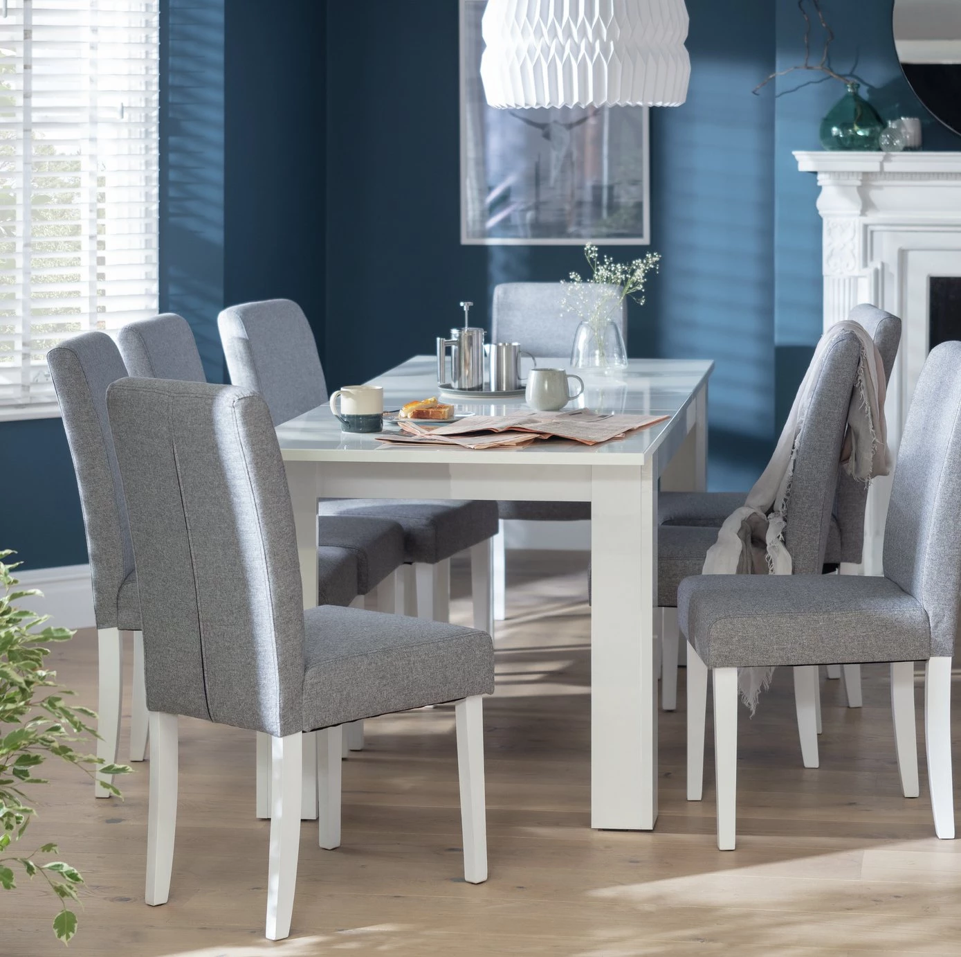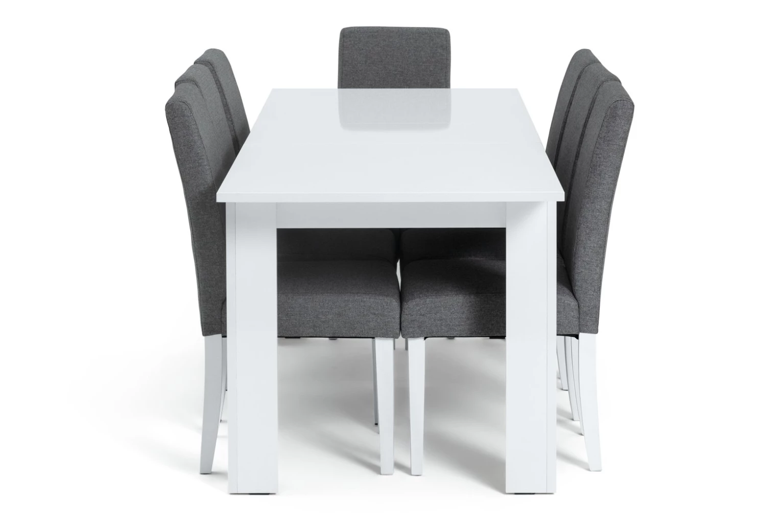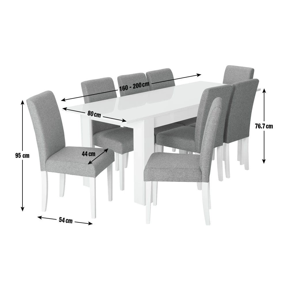 The set includes 8 midback chairs with tactile grey tweed fabric and sturdy solid beech legs in white. Tuck into family feasts or linger over drinks with friends, at this delectable dining set.