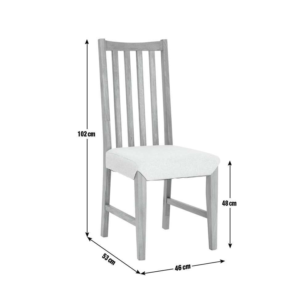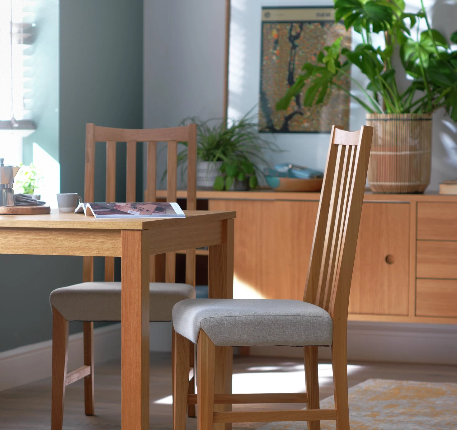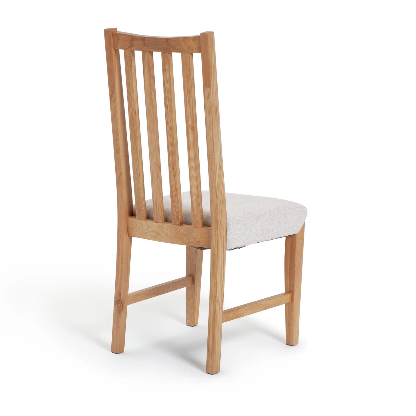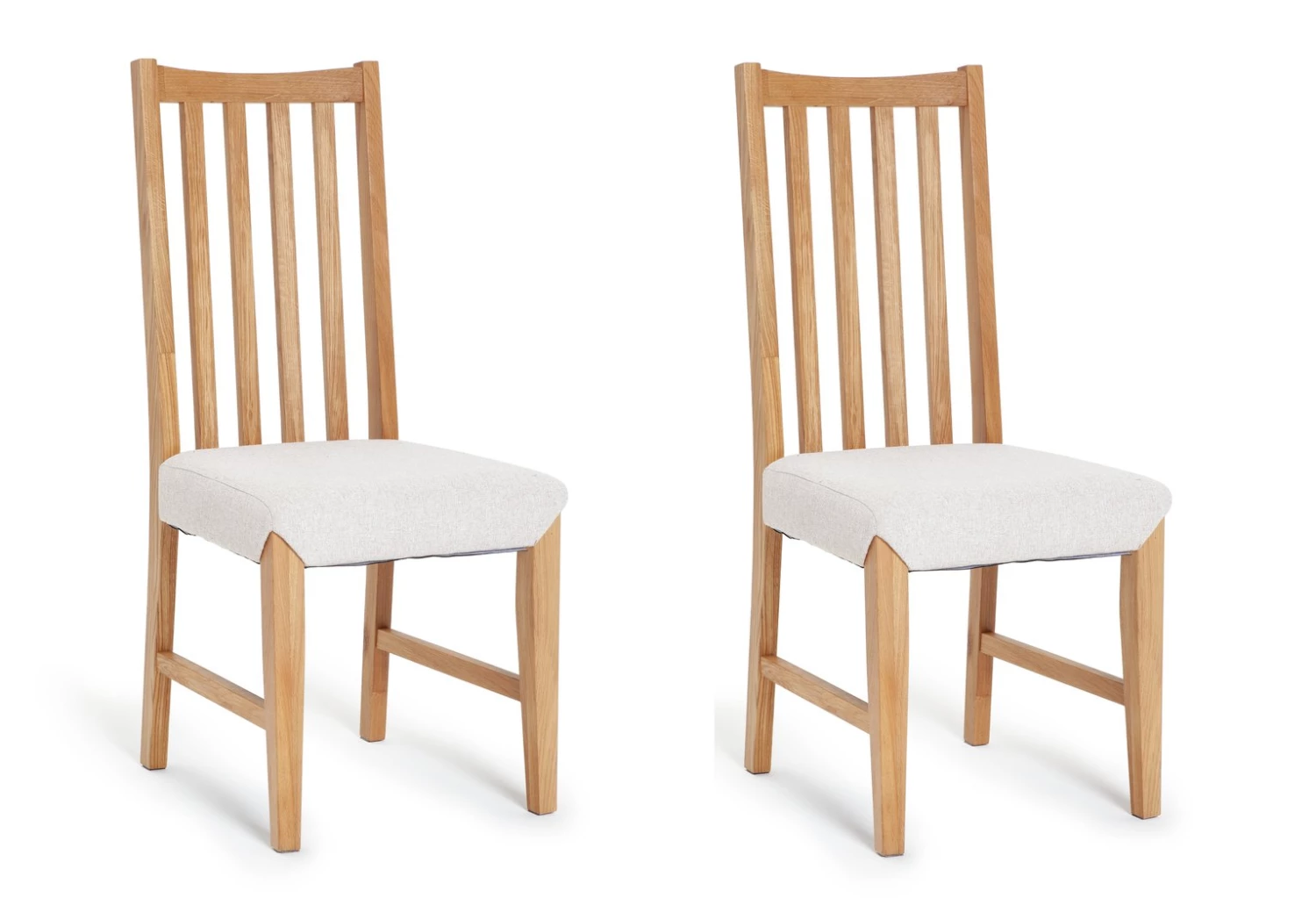 Keep it warm. Keep it classic. This pair of Rosmond dining chairs are naturally traditional. The airy slatted wooden backs give your home a farmhouse feel. You can almost smell the bread baking in the Aga. The solid oak frame contrasts beautifully with the light toned covers. Together they're warm and homely. The comfy upholstered seats invite you to sit awhile. Enjoy supper. Chat over the day. Rosomond says, welcome home.