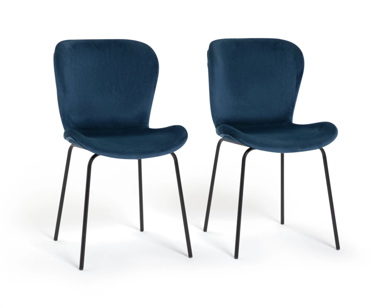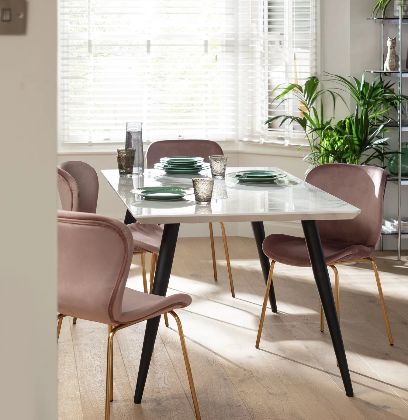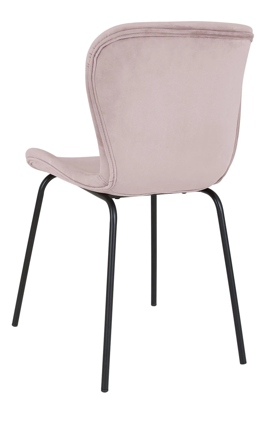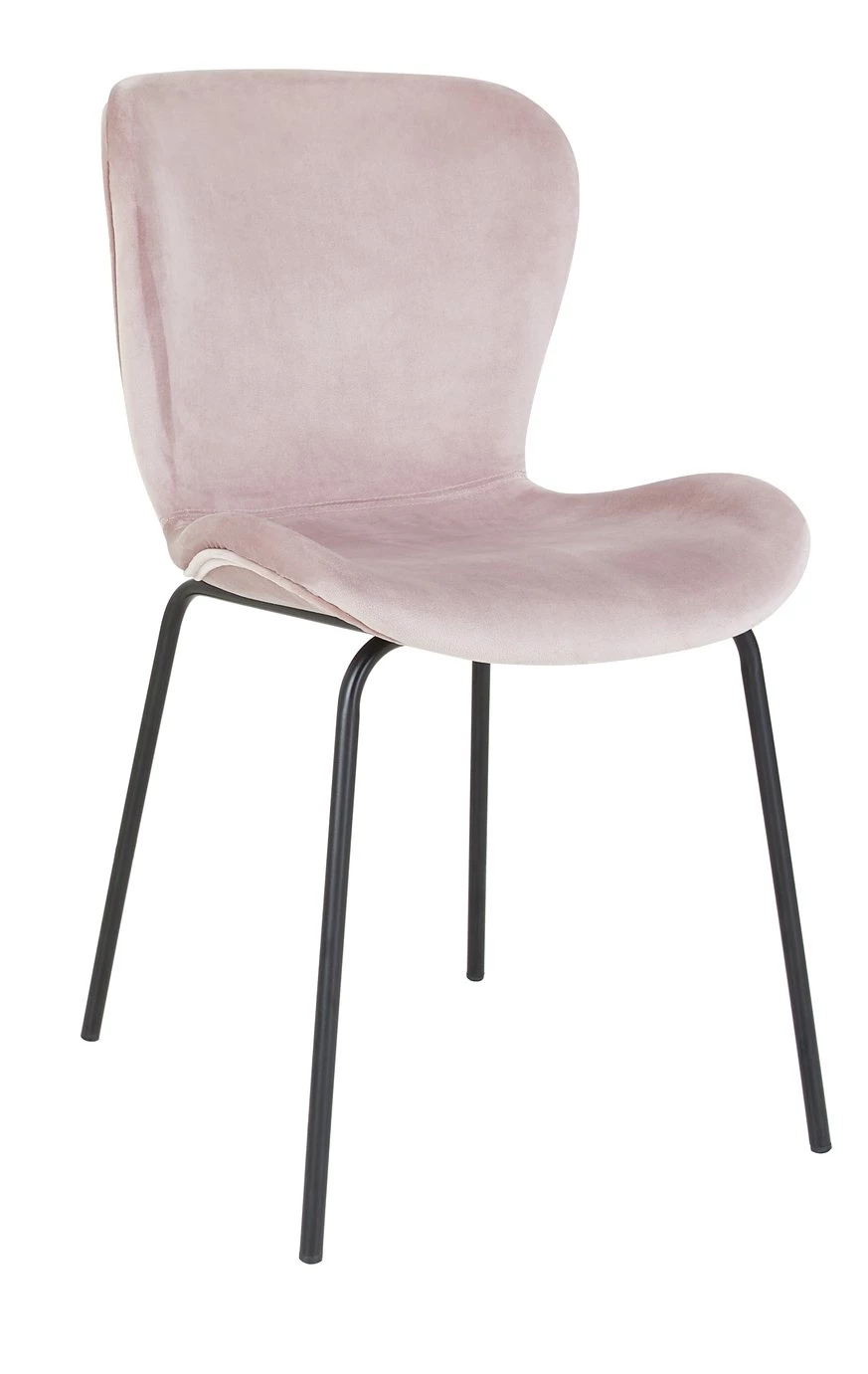The Etta pink velvet upholstered dining chair with black metal legs has a slightly scooped seat with a curved back and rounded edges for comfort. The dining chair complements the Etta black-stained oak extending dining table and other designs in our collection. The Etta range includes a sideboard and bench, and the chairs are available in a wide choice of colours, materials and finishes.
