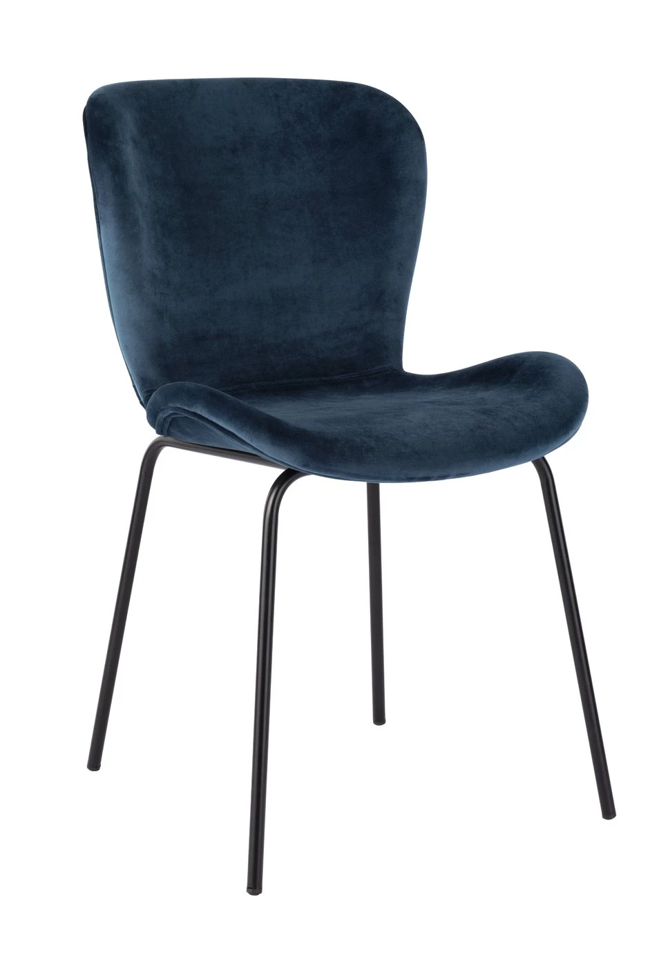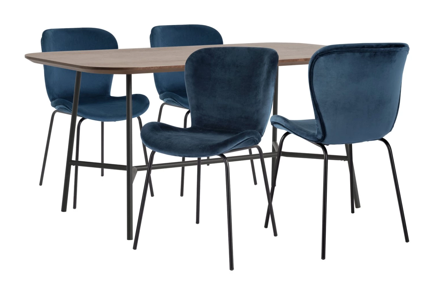 Simply delicious. With a nod to mid-century cool, this 4-seater dining set brings a retro flavour to the table. Unfussy in its design, the gently rounded tabletop is finished in a practical smooth grain wood veneer. And sits on a no-nonsense slim black metal frame While 4 blue velvet padded chairs with matching black metal legs, create a curvy comfortable excuse for a dinner party. Hunker down with Huntington.