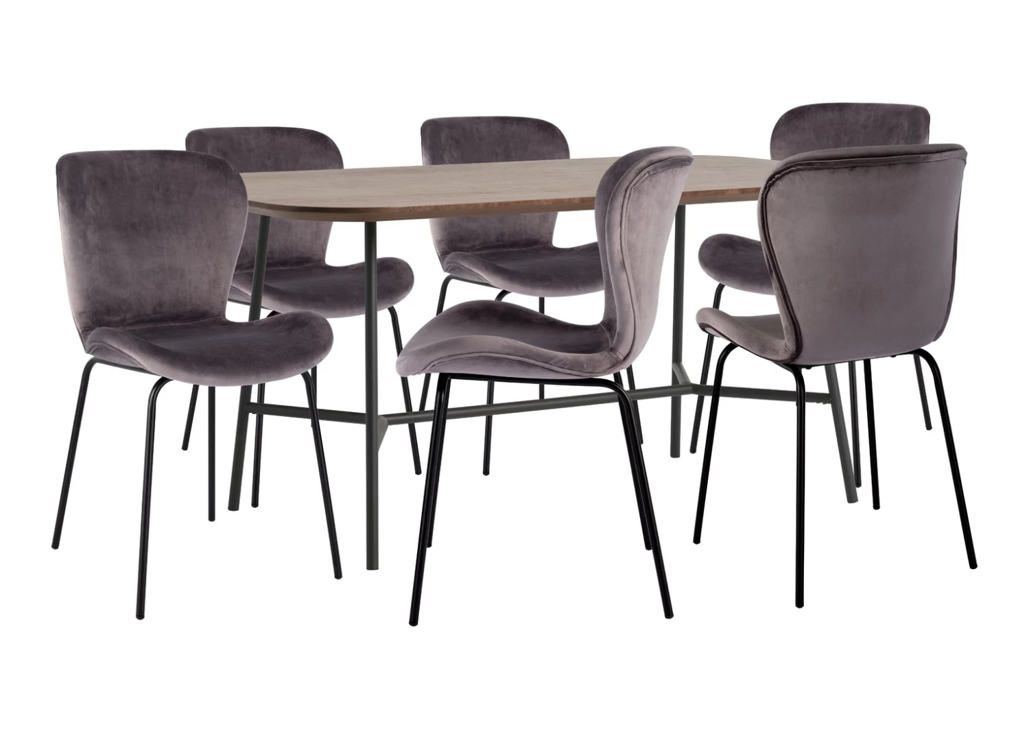Simply delicious. With a nod to mid-century cool, this 6-seater dining set brings a retro flavour to the table. Unfussy in its design, the gently rounded tabletop is finished in a practical smooth grain wood veneer. And sits on a no-nonsense slim black metal frame. While 6 grey velvet padded chairs with matching black metal legs, create a curvy comfortable excuse for a dinner party. Hunker down with Huntington.