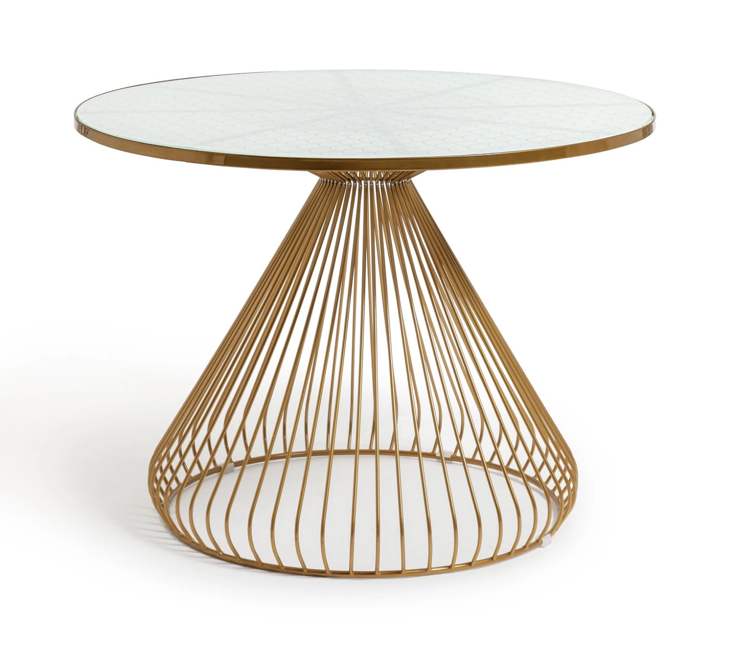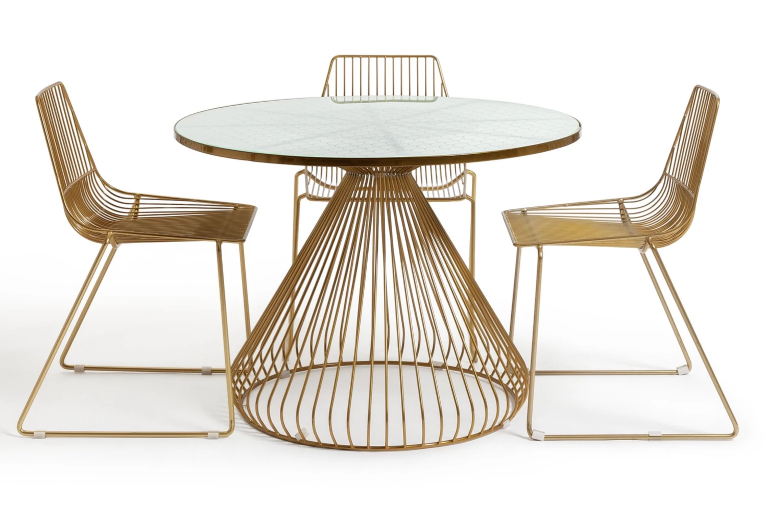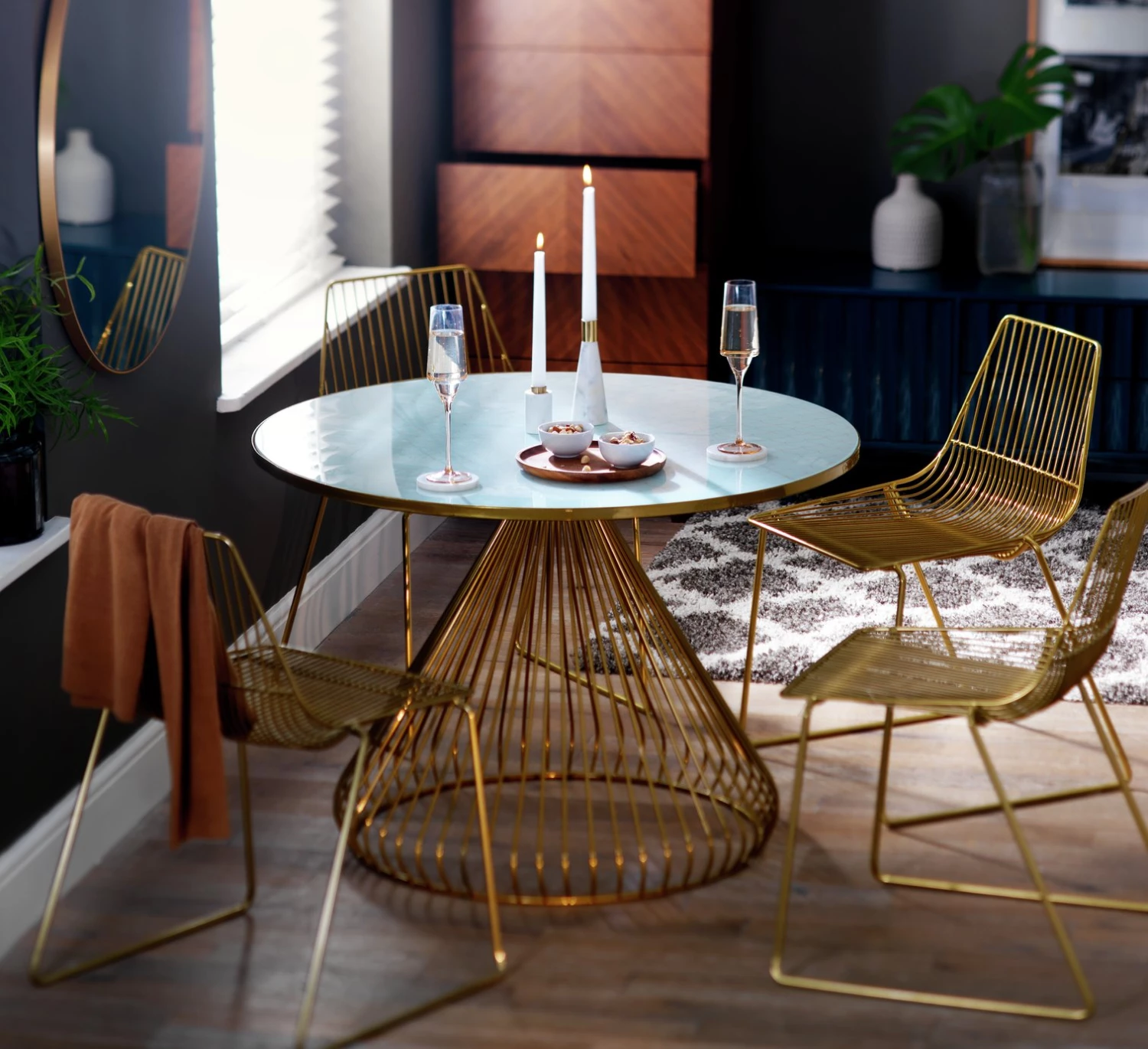 What a show stopper. We can't take our eyes off this fabulous hourglass table and 4 matching chairs. We're loving the fusion of decorative glass and polished brass. Pure glamour. Take a look at the scalloped pattern glass table. It's the hot design trend. The brass base and 4 chairs are stylishly cool with a unique industrial vibe. Crack open the wine, serve up the nibbles.