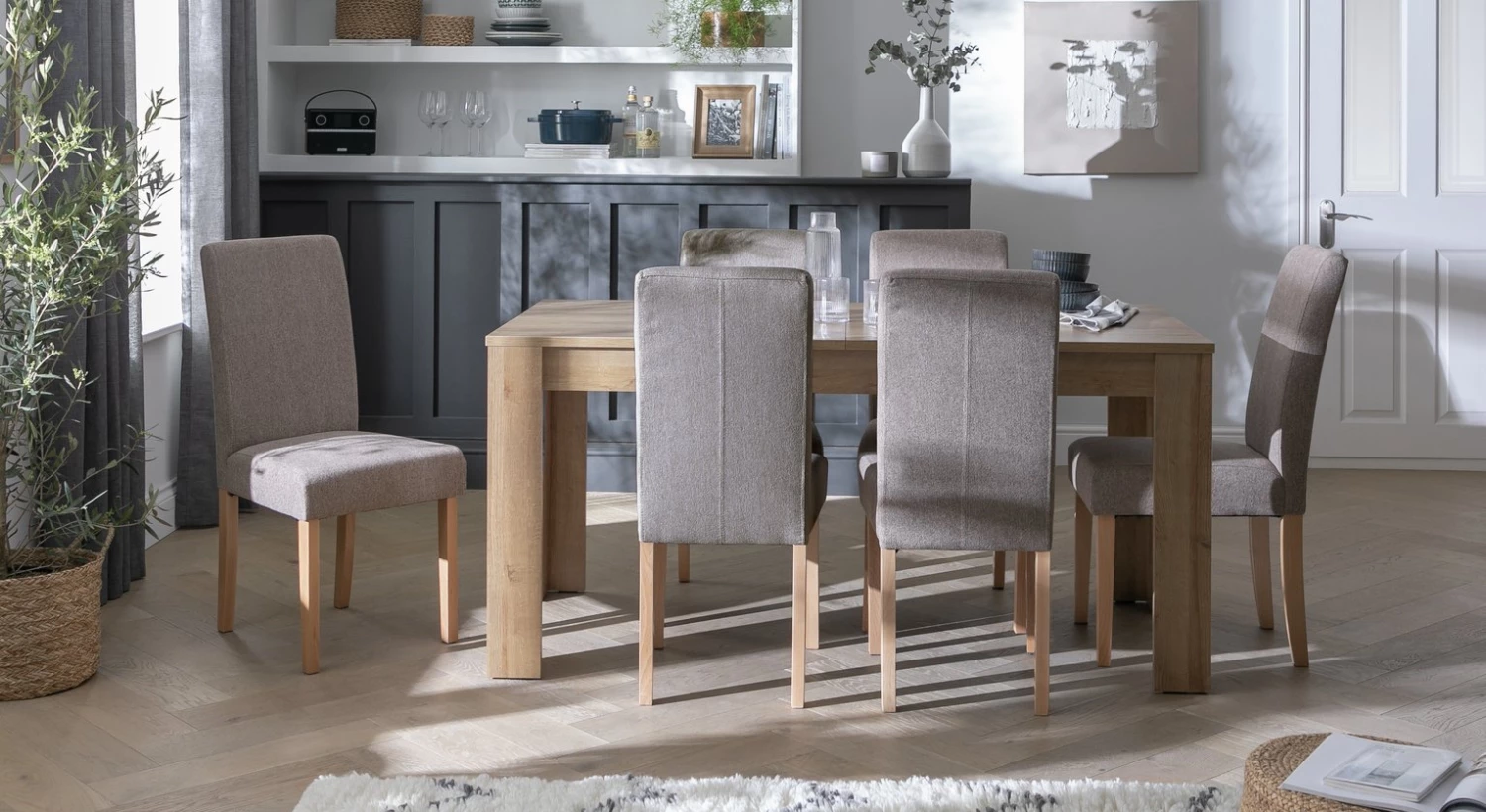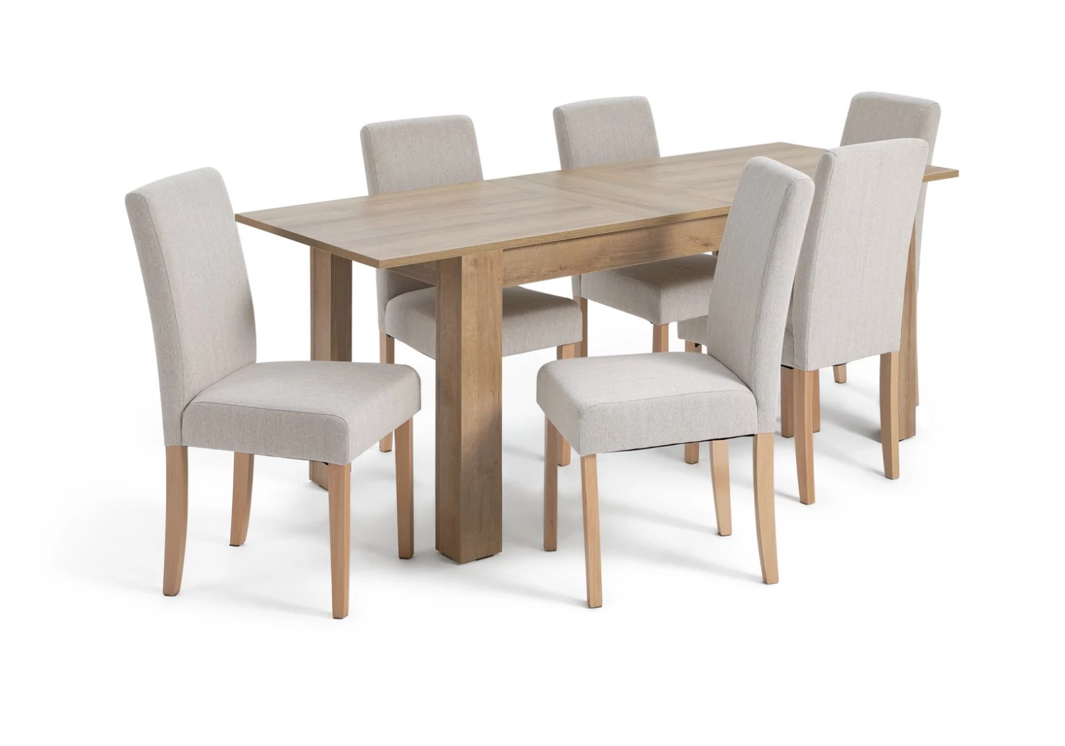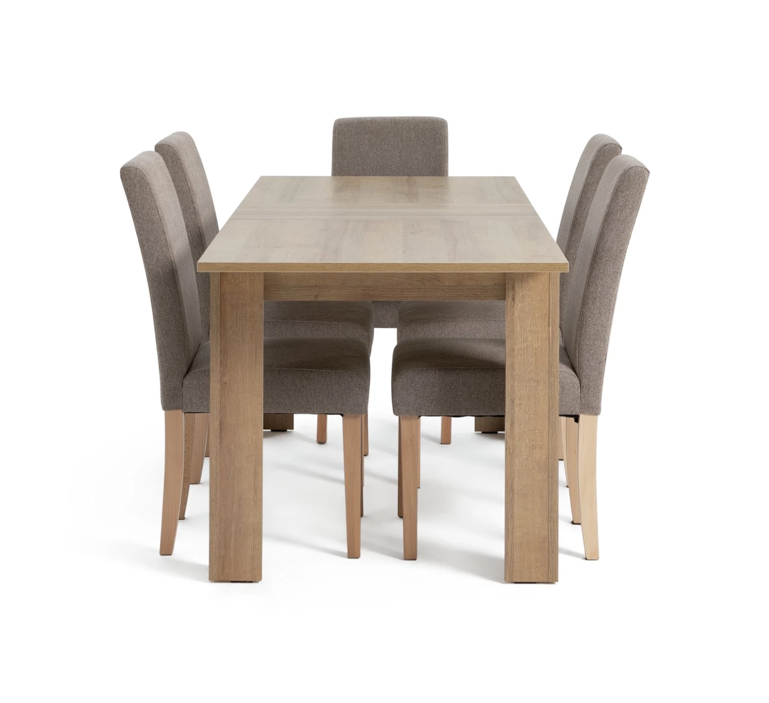 Make meals memorable with our Miami 6-seater dining set. Country cottage charm and minimalist design come together with the table's clean lines and pillar legs. Upholstered in warm brown fabric, the solid wood chairs are a classic choice and create a subtle contrast against the natural wood effect. With a removable central leaf extension piece, the table can be lengthened when you're hosting more people or just serving up a massive spread. Yum!