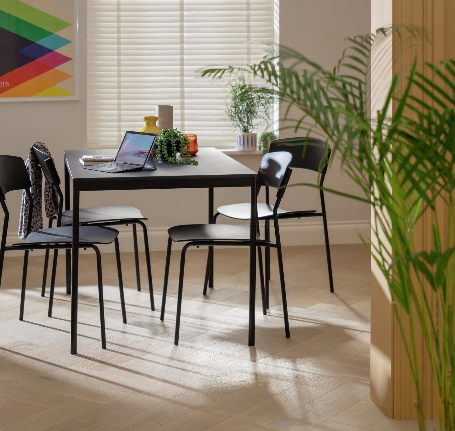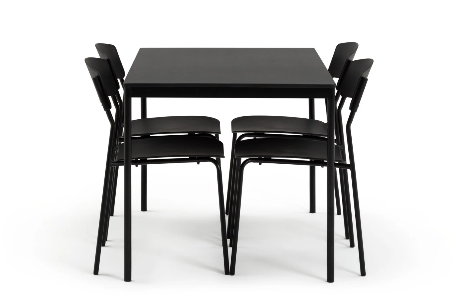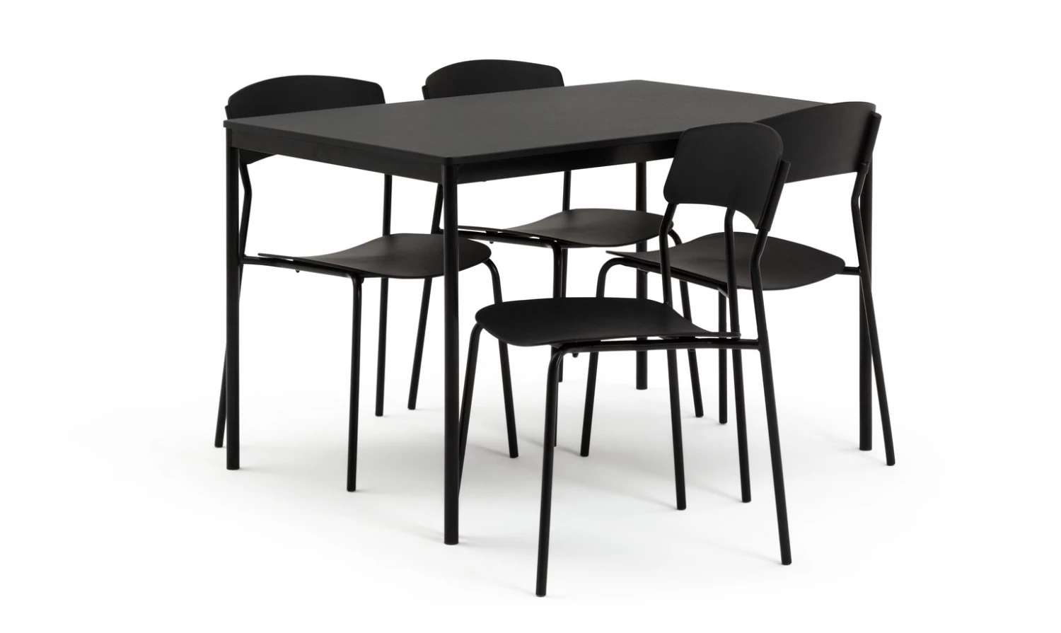 Dinner is served. Our lightweight, wood-effect dining table and 4 chairs sets the stage for family mealtimes and delicious dinner party spreads. Handsomely modern in midnight black, it looks good in a minimalist, contemporary kitchen. Get ready for a super comfy dining experience with cleanly curved seats and high backs for support. Pull up a chair. Eat, drink and chat the night away.