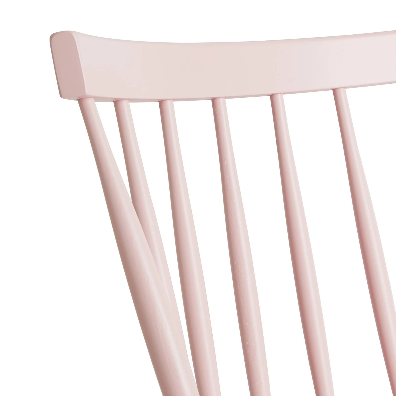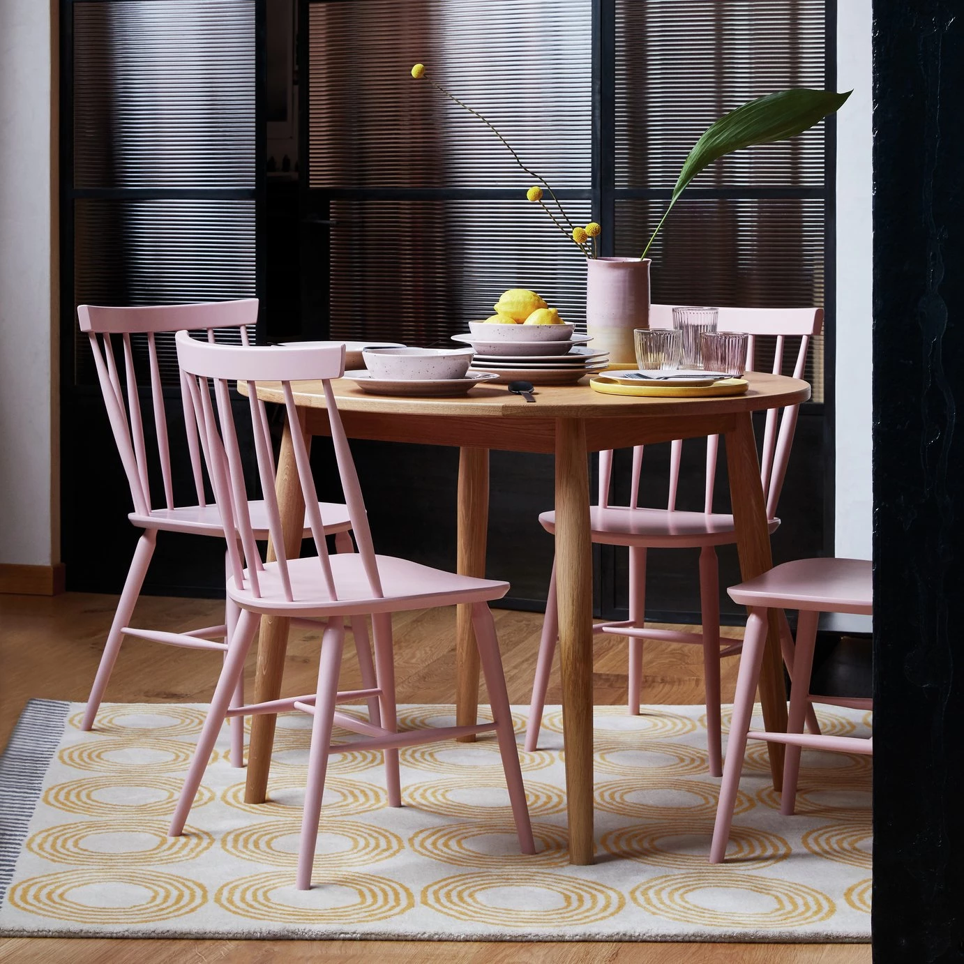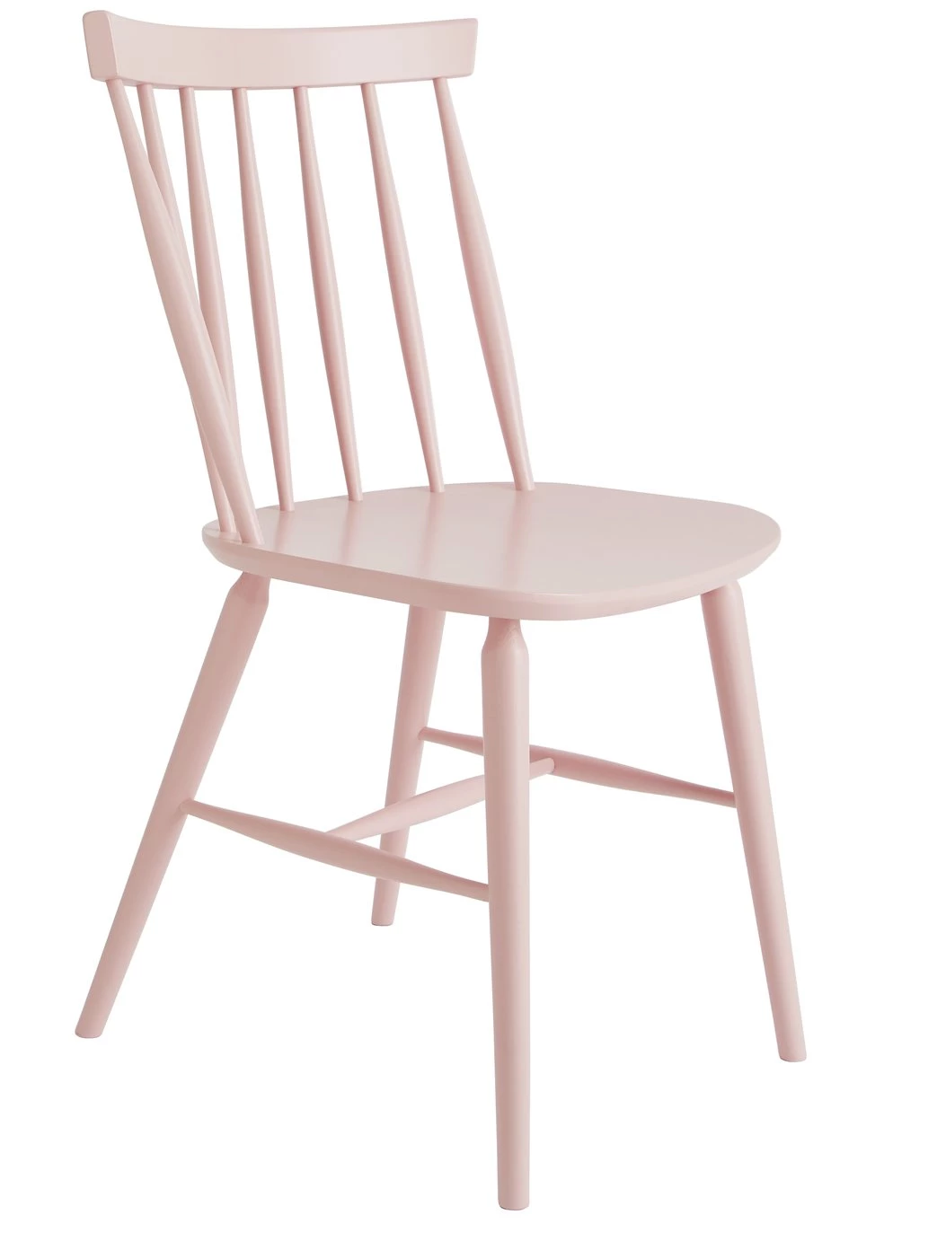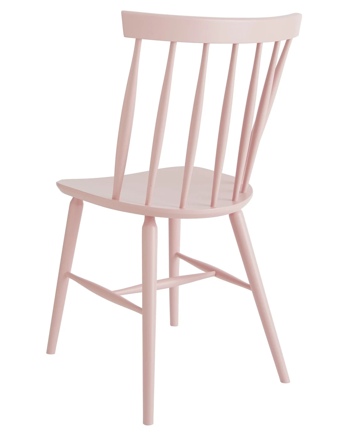 A contemporary update on a traditional design. This pair of striking spindle-back Talia dining chairs work well with a variety of table styles. In pale pink, they can also provide a strong visual contrast. Made from hard-wearing, lacquered solid beech wood with turned rods and a classic H-shaped support structure. Characterful country kitchen chairs.